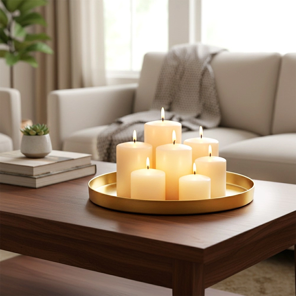 Stabil alap több, különböző magasságú gyertyához, amely meghitt hangulatot és látványos asztali fókuszpontot teremt.