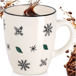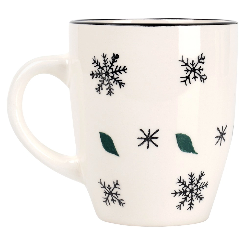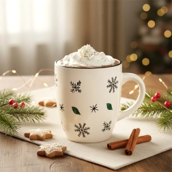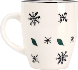 Teremtsen meghitt pillanatokat ezzel a kerámia bögrével, amely minden kortyból kellemes téli rituálét varázsol. A fehér felületet fekete hópelyhek és finom zöld motívumok díszítik, amelyeket egy vékony fekete perem emel ki az elegáns megjelenésért. A bögre univerzális formájú, kényelmes a fogása, és gond nélkül illeszkedik a mindennapi rutinjába.