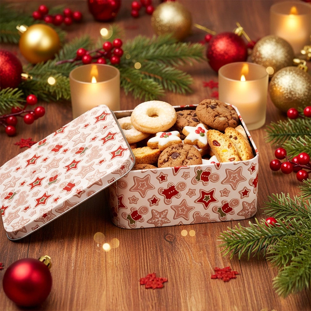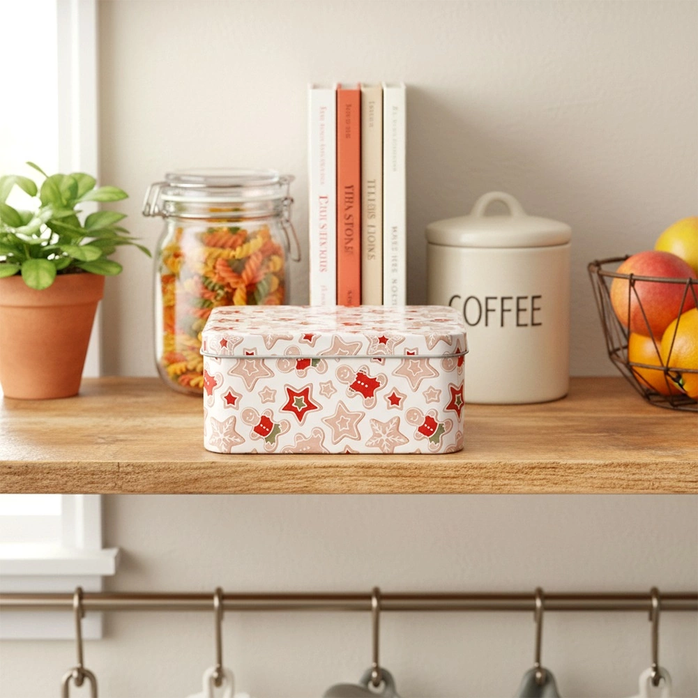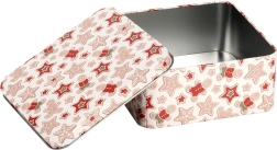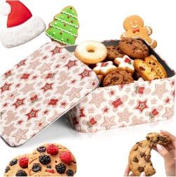Ez a négyzet alakú fém doboz finom karácsonyi mintákkal – mézeskalácsokkal, csillagokkal és téli motívumokkal – kiváló a mindennapi és szezonális használatra egyaránt. A masszív fedélnek köszönhetően segít tovább frissen és védetten tartani a finomságokat.