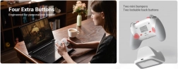 Versenyjátékhoz ott vannak az optikai ABXY mikrokapcsolók, a precíz mechanikus D‑pad, a két R5/L5 minibumper és a két programozható hátsó gomb R4/L4 véletlen lenyomás elleni zárral. A négy rezgő motor a ravaszokban és a markolatokban magával ragadó haptikát nyújt, a cserélhető mágneses, háromrészes előlap pedig személyre szabást biztosít.