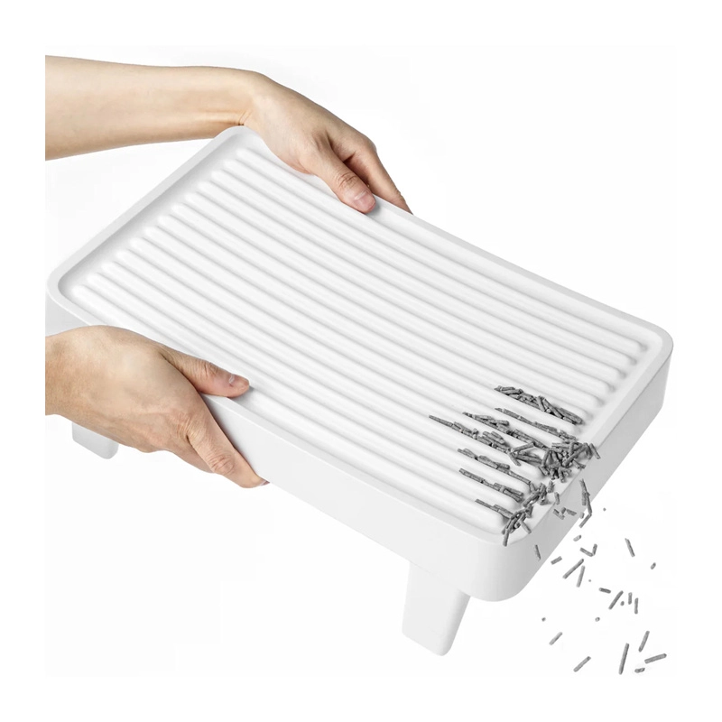 A robusztus, tartós ABS műanyagból készült test hosszú távon megőrzi stabilitását és tiszta megjelenését. A csúszásmentes alap megakadályozza az elmozdulást és védi a padlót a karcolásoktól. Az okos geometria és a megemelt szélek révén a használat kényelmes és biztonságos minden korú macska számára.