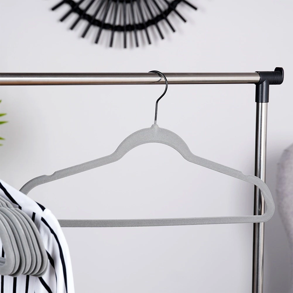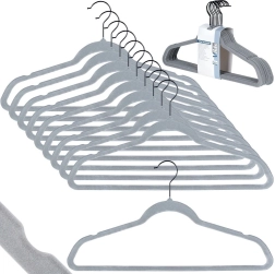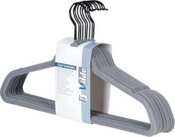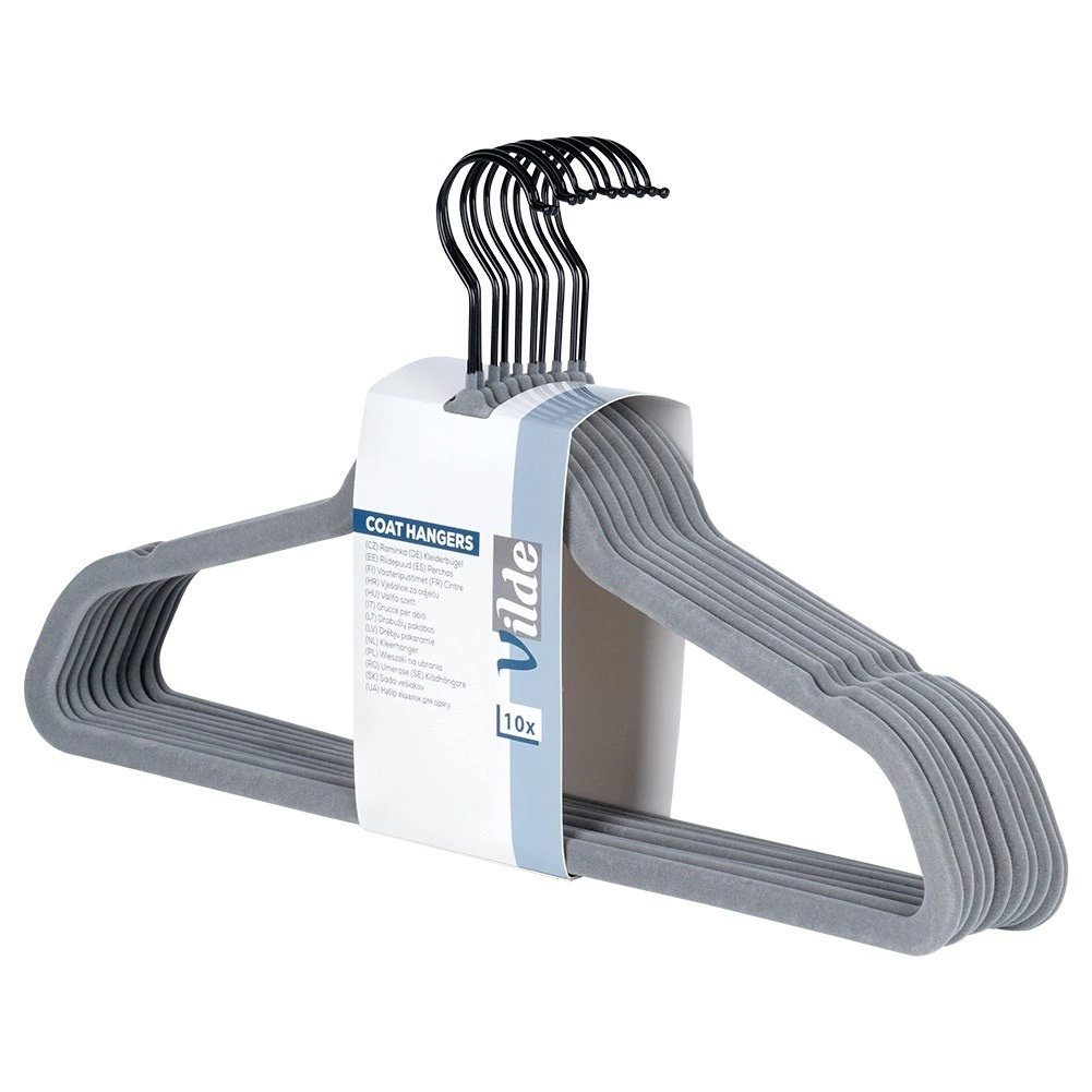 Szürke Vilde bársony fogasok helytakarékosak, és megbízhatóan tartják a ruhákat lecsúszás nélkül. Csúszásgátló velúr, forgatható fém kampó és univerzális, 45 × 24,5 cm-es méret ingekhez, ruhákhoz és kabátokhoz. Praktikus 10 darabos csomag a szekrény könnyű rendszerezéséhez.