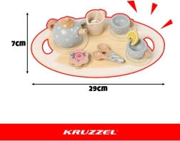A bájos, szürke kivitelű Kruzzel fa teás készlet hosszú órákra leköti a gyerekek fantáziáját. Tartalma: teáskanna, tejkiöntő, csészék csészealjakkal, kanalak, kekszek, citromszelet, teafilter és tálca. Biztonságos kivitelezés, tartós fa és élethű kiegészítők segítik a finommotorika fejlesztését, a szociális készségeket és a játékon keresztüli tanulást.