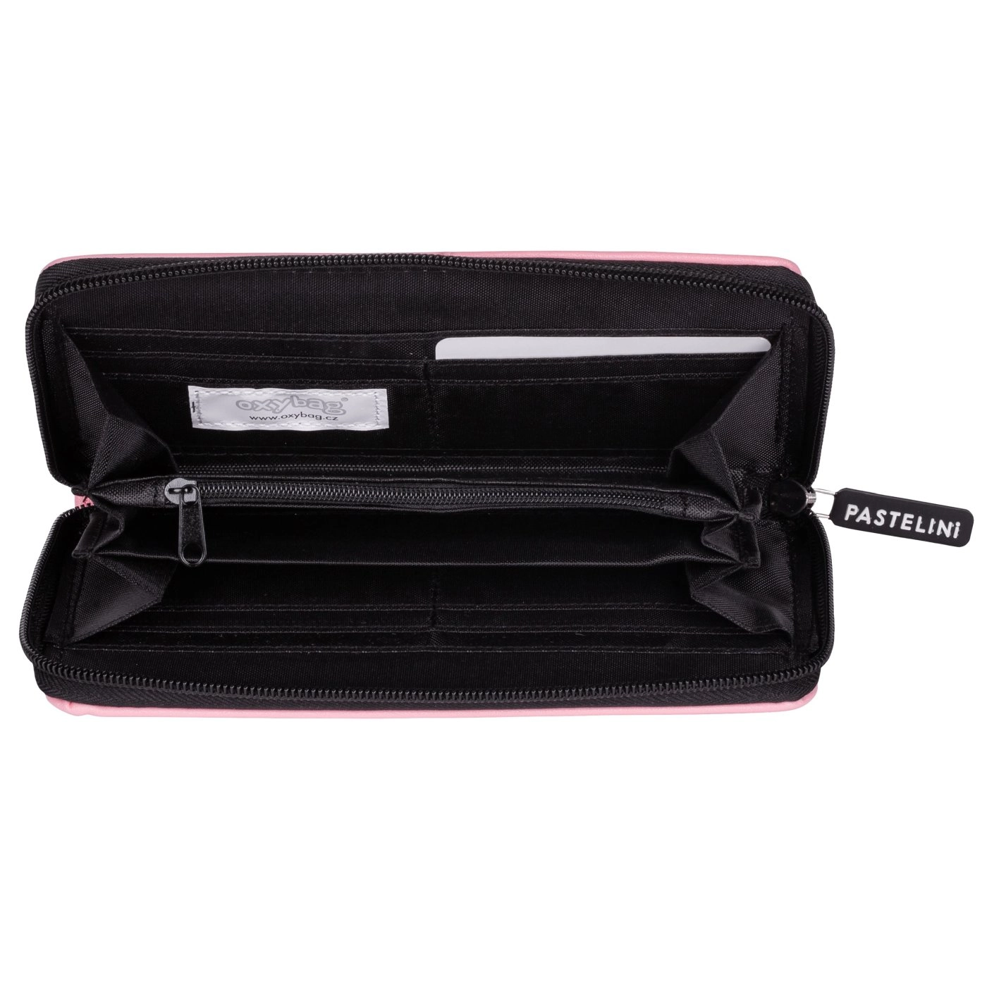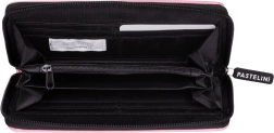 Stílusos rózsaszín pénztárca körbefutó cipzárral és minimalista PASTELINI logóval, amely biztonságosan tárolja a bankjegyeket és kártyákat, és kényelmesen illeszkedik a kézbe.