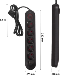 Ez a kompakt és strapabíró elosztó a hagyományos aljzatokat beépített USB töltéssel kombinálja, így helyet és adaptereket takarít meg. A széles bemeneti feszültségtartomány 110–240 V AC (50/60 Hz) megbízható működést garantál különféle körülmények között, a maximális 2500 W terhelés pedig a legtöbb általános készülékhez elegendő.