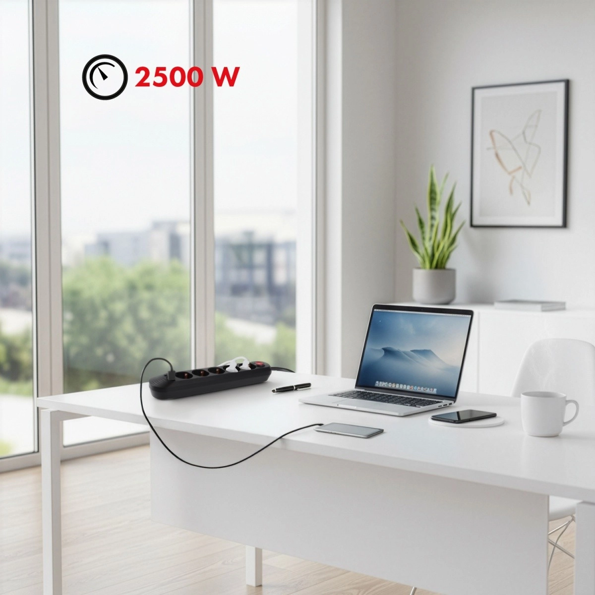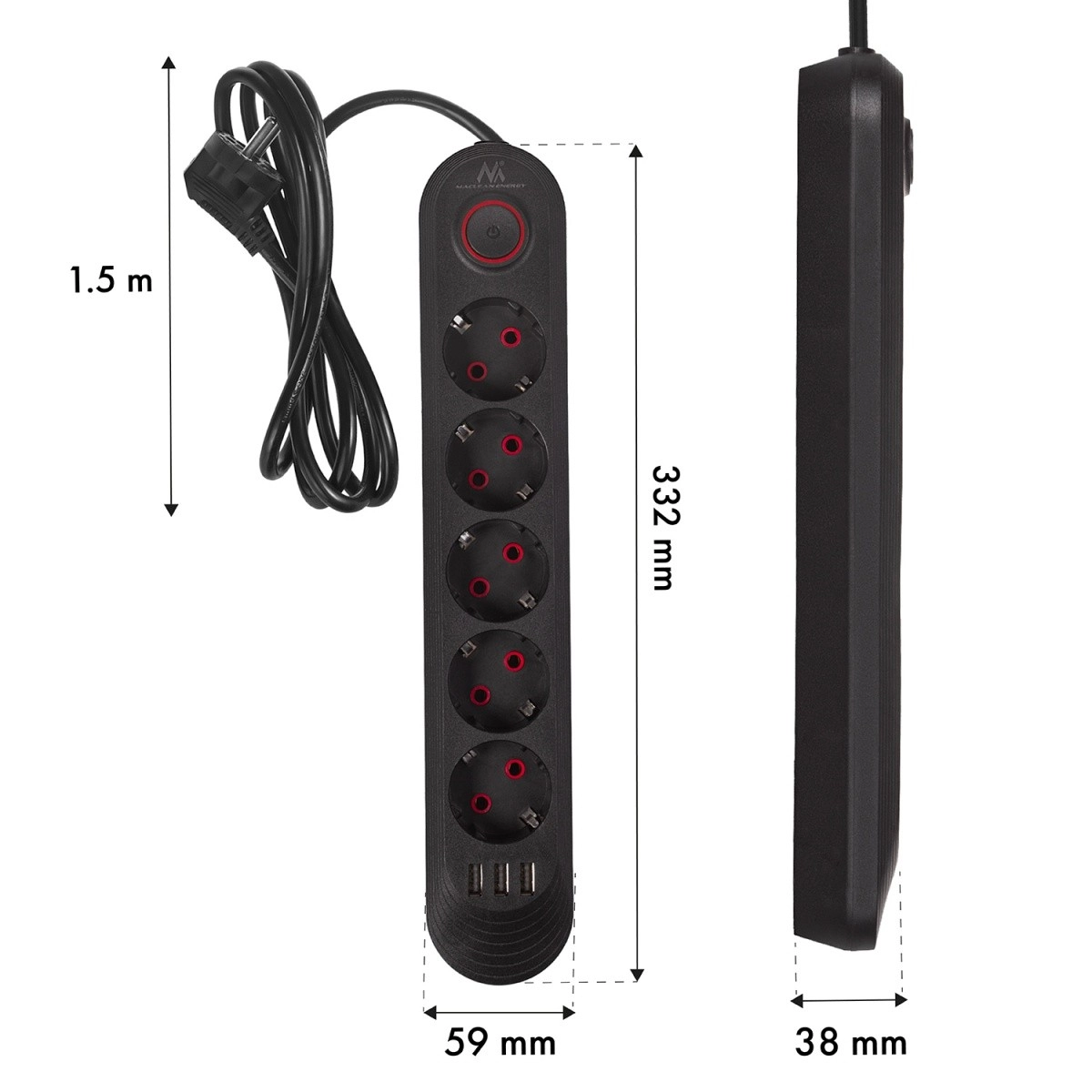 Az öt Schuko aljzat és a három USB port lehetővé teszi a háztartási eszközök áramellátását, miközben telefonokat, táblagépeket vagy fülhallgatókat tölthet – külön adapterek nélkül.