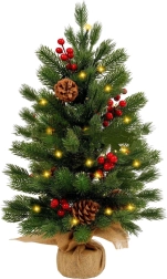 A körülbelül 60 cm magas, kompakt mű karácsonyfa szépen beragyog bármely belső teret. Meleg fényű LED világítással, 3 üzemmóddal, élethű tűlevelekkel, piros bogyókkal és természetes tobozokkal díszítve, valamint stabil, zsákvászonba burkolt talppal rendelkezik. A csomag 3× AG13 elemet is tartalmaz az azonnali használathoz.