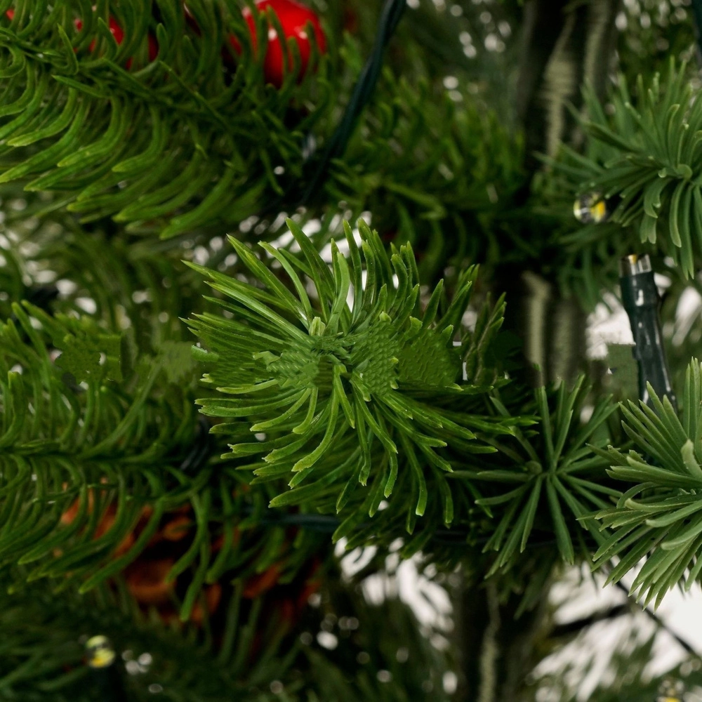 Az integrált LED fényfüzér 3 világítási móddal finom, meleg fényt ad. A hajlítható ágkialakítás megkönnyíti a formázást, míg a piros bogyók és tobozok természetes, klasszikus megjelenést biztosítanak. A nehezített talp, zsákvászon borítással, stabilan a helyén tartja a fát, és kiemeli a rusztikus stílust.