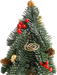 A kompakt, természetes törzsön álló dekoratív karácsonyfa minden enteriőrbe ünnepi hangulatot és elegáns téli varázst visz. A sűrű ágacskák élethűen utánozzák a tűleveleket, amelyeket piros bogyók, tobozok és arany akcentusok egészítenek ki. A stabil fa talp biztonságos elhelyezést biztosít asztalon, polcon vagy komódon.