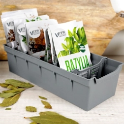 Ez a konyhai fűszerrendező ideális megoldás a szárított fűszerek és gyógynövények tasakjainak tárolására. A kompakt, 30 × 13 × 8 cm-es méreteknek köszönhetően tökéletesen illeszkedik a konyhafiókba vagy a polcra, és áttekinthetően, stabilan állítva tartja a tasakokat felborulás vagy kiszóródás nélkül.