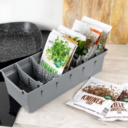 A rendező minőségi, tartós műanyagból készült, elegáns szürke színben. Belül öt kivehető válaszfal található, amelyek hat részre osztják a teret – így könnyen kialakíthatsz elkülönített rekeszeket a különféle fűszerekhez, és gyorsan megtalálod, amire szükséged van. Nemcsak zárt, hanem megkezdett tasakokhoz is remek.