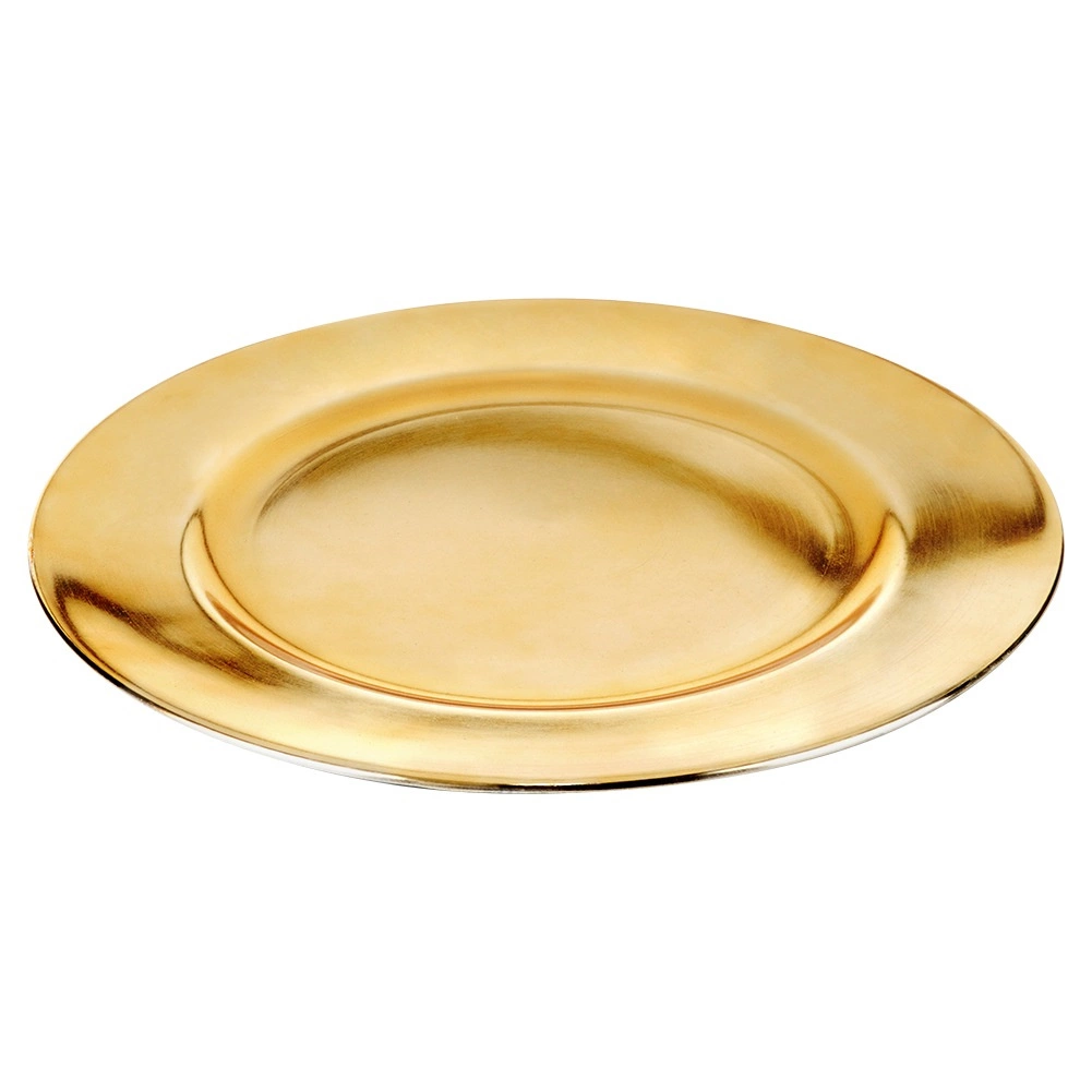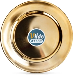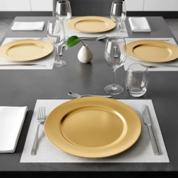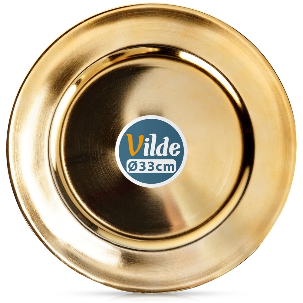 Elegáns, 33 cm átmérőjű arany tányéralátét, amely luxus megjelenést kölcsönöz az asztalterítésnek, megóvja a terítőt és az asztallapot, valamint kiemeli a szervírozást. Minőségi anyagból, magas fényű felülettel, könnyen tisztítható, és kiválóan illik ünnepi terítésekhez, esküvőkhöz és családi összejövetelekhez.