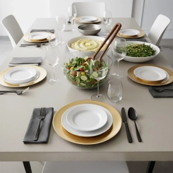Széles pereme és fémes hatása reprezentatív külsőt ad a terítéknek – tökéletes ünnepi asztalokhoz és a mindennapi eleganciához is.