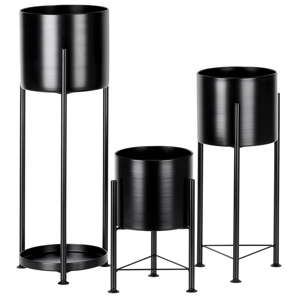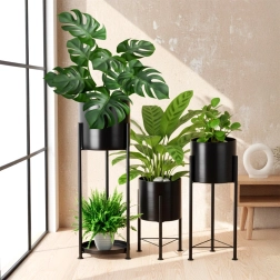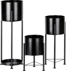 A három fekete fém kaspó karcsú állványokon kiemeli kedvenc növényeit és modern hangulatot ad a térnek. A cserepek az állványokról egyszerűen kivehetők és áthelyezhetők, ami megkönnyíti az öntözést és a karbantartást. A nagy kaspóhoz praktikus lerakó tálca is tartozik apró zöldekhez vagy kiegészítőkhöz.