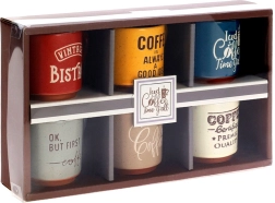 Élvezze minden korty örömét a 6 darabos, dizájnos kerámia eszpresszócsésze-készlettel. A színes kivitel egyedi kávés feliratokkal feldobja az asztalát, míg a kompakt 110 ml űrtartalom tökéletes a valódi olasz eszpresszóhoz.