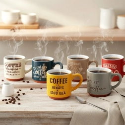 Stílusos, hatdarabos kerámia eszpresszócsésze-készlet 110 ml űrtartalommal, különböző színekben feliratokkal. Tartós kerámia, kényelmes fül, és mosogatógépben és mikrohullámú sütőben is használható – ideális a mindennapi kávézási rituálékhoz otthon és az irodában.