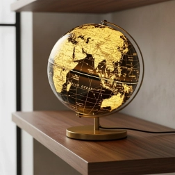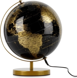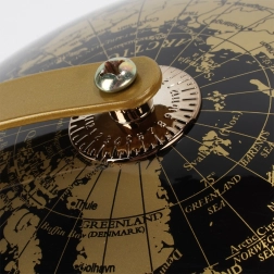 A részletgazdag földgömb fekete és arany színben, valamint a stabil fém talp modern, luxus hatást kölcsönöz a belső térnek.