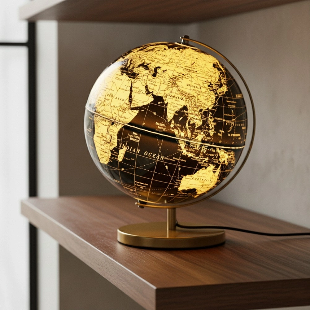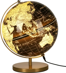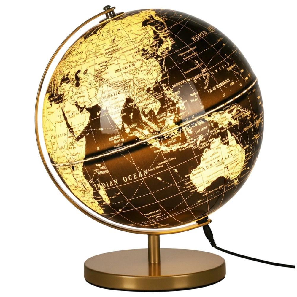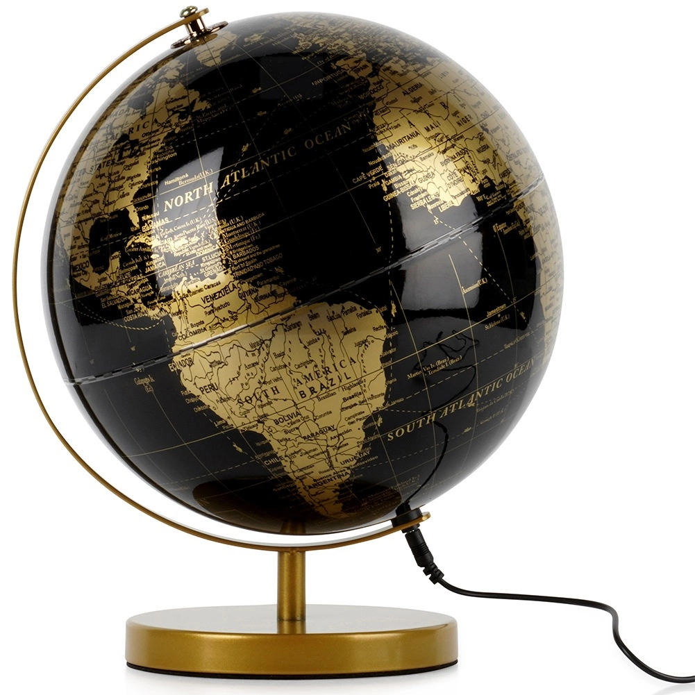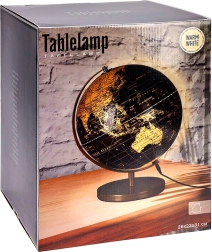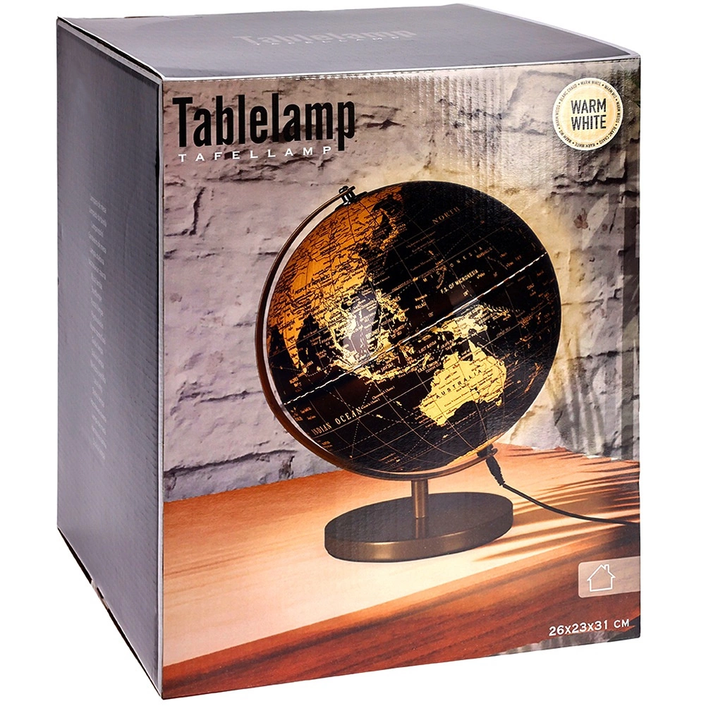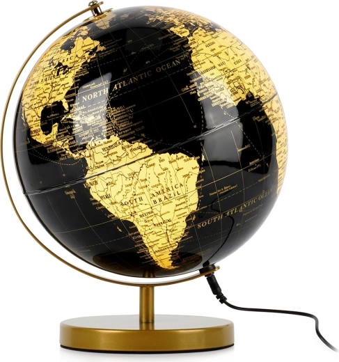 Elegáns, földgömb alakú asztali lámpa 26 × 25 × 31 cm méretben, amely stílust és funkcionalitást visz az enteriőrbe. A fekete és arany színek kombinációja, a stabil fém talp és a meleg fehér LED világítás kellemes hangulatot teremt pihenéshez és munkához egyaránt. A lámpa USB-tápról működik 1 m hosszú kábellel, és csúszásgátló filc alátéttel védi a bútort.