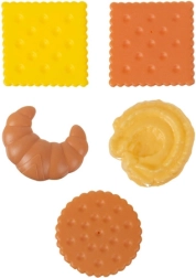 Tányérok, evőeszközök, italok, pékáru, tojás, sütik, csirke és szószok – minden a tálaláshoz, keveréshez és étkezéshez. A gyerekek megismerik az élelmiszerek formáit és neveit.
