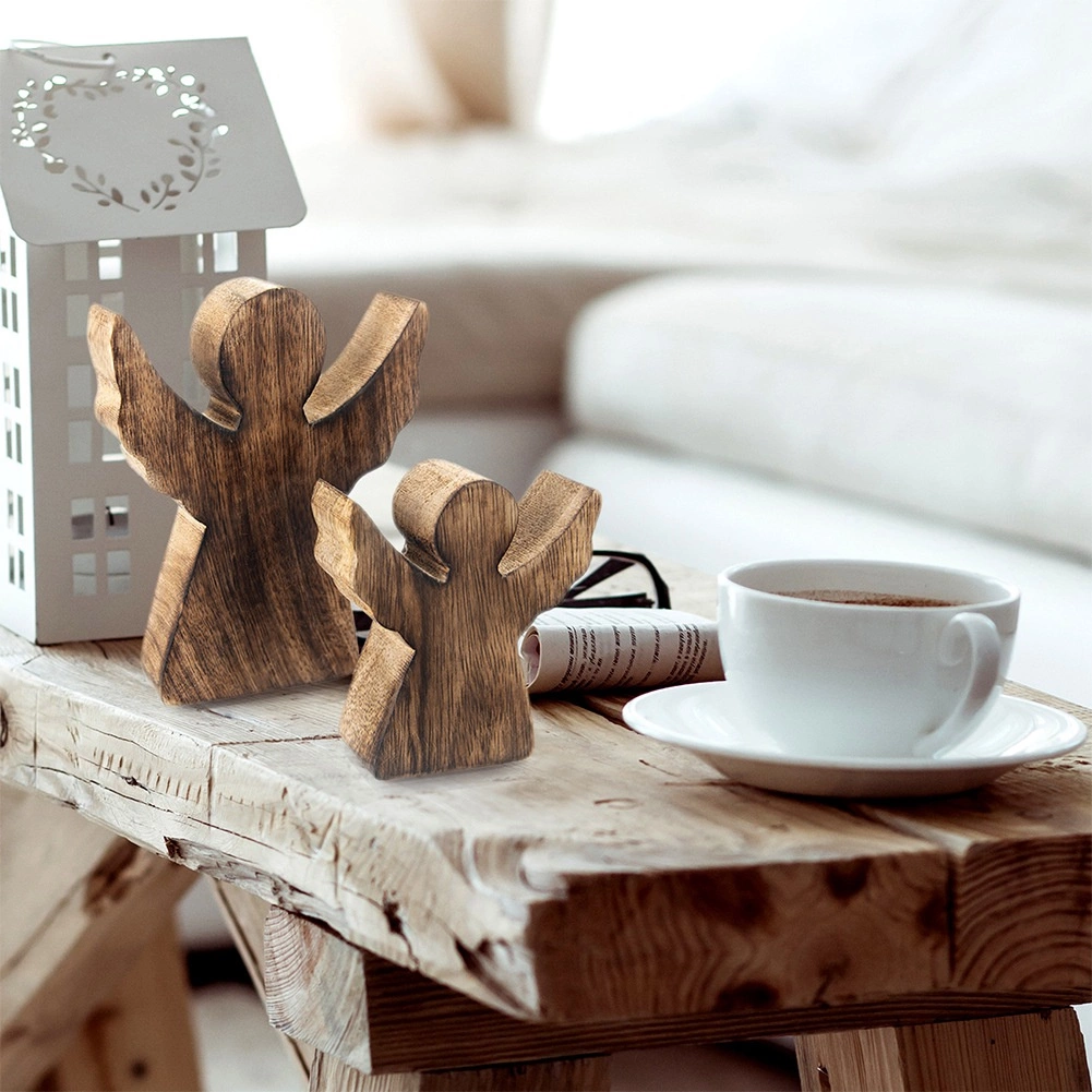 Stílusos, 10 cm magas, mangófából készült angyalfigura, amely a belső térbe természetes varázst és meghitt hangulatot visz. A kézműves hatású kidolgozásnak és a természetes árnyalatoknak köszönhetően bármilyen lakberendezési stílushoz illik, és kiváló ajándékötlet különféle alkalmakra.