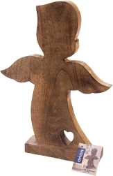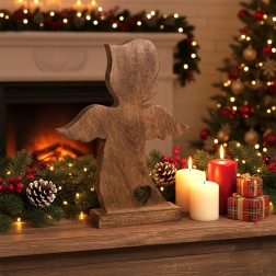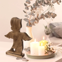 A minőségi mangófából készült angyalfigura természetes megjelenésével és tiszta vonalaival tűnik ki. A stabil talpnak köszönhetően azonnal kihelyezhető a nappaliban, hálóban, előszobában vagy irodában. A minimalista forma szívkivágással otthonos légkört teremt, különösen a karácsonyi időszakban, de az év minden napján jól érvényesül.