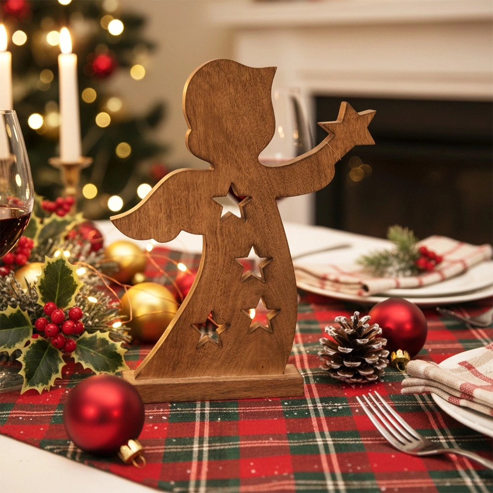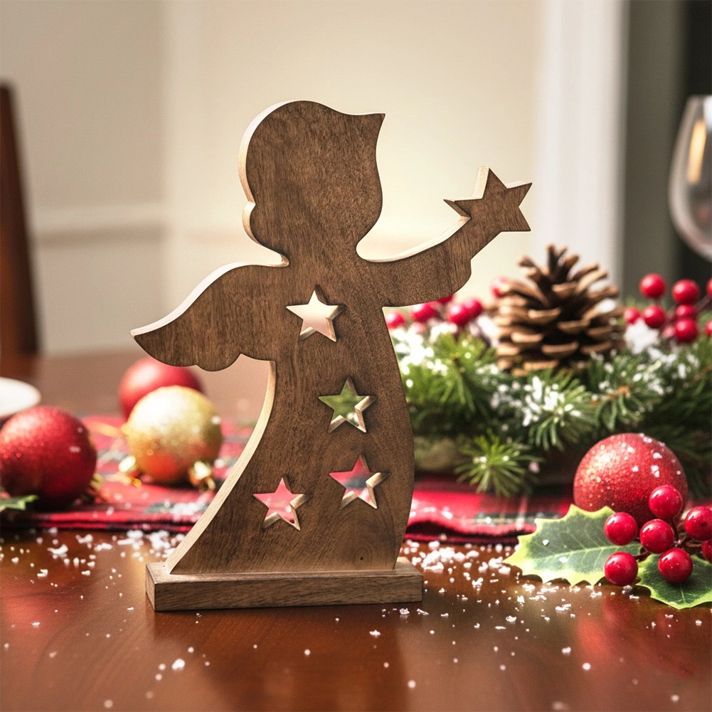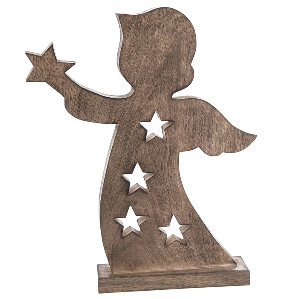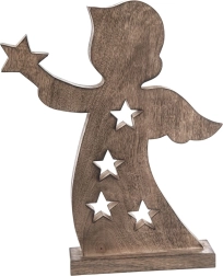 Ez a minőségi mangófából készült, természetes árnyalatú angyalszobor nyugalmat és meghitt hangulatot visz az enteriőrbe. A csillagos perforációk átengedik a fényt és látványos fény–árnyék játékot hoznak létre – ideális téli és karácsonyi dekorációnak, de egész évben is díszíthet.