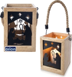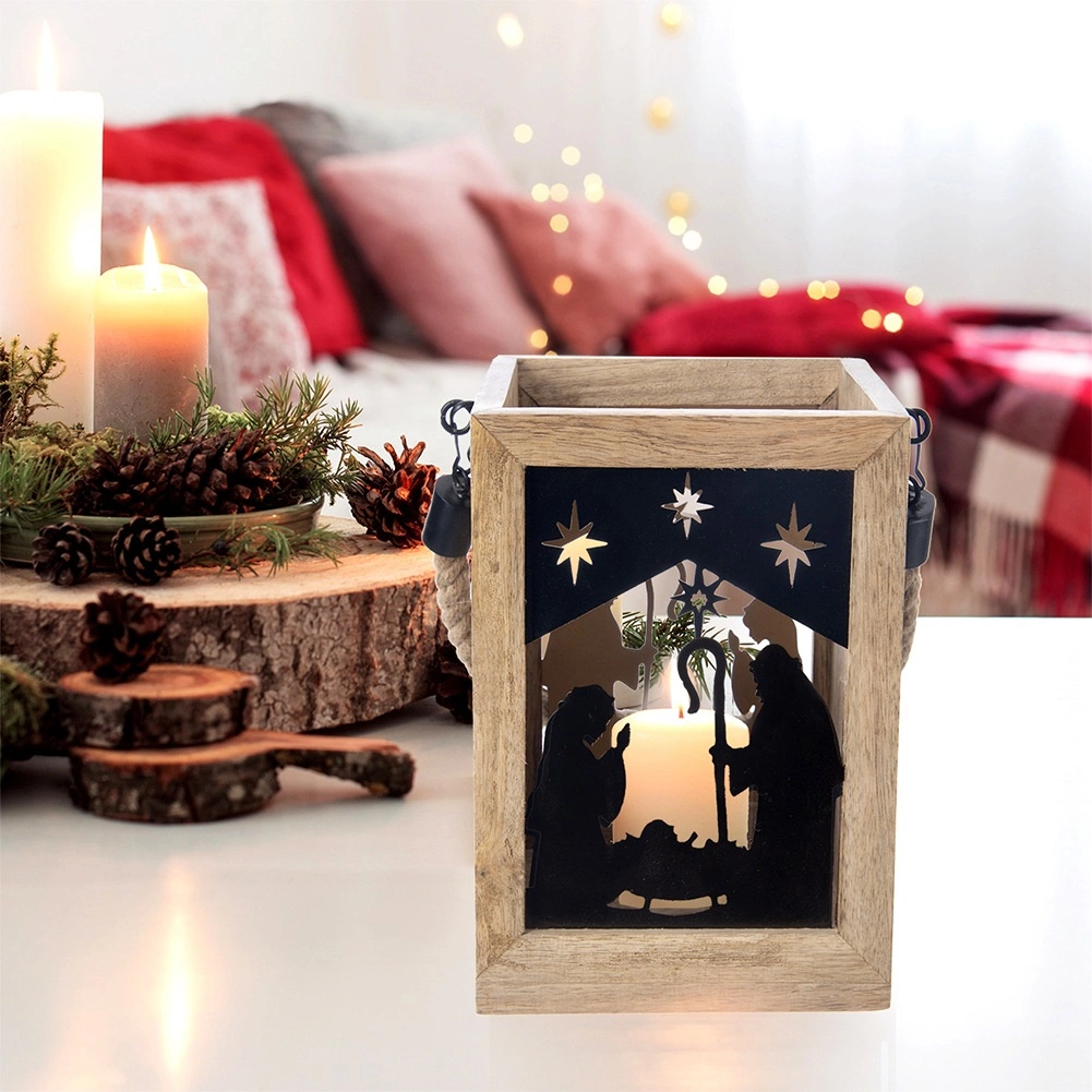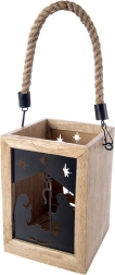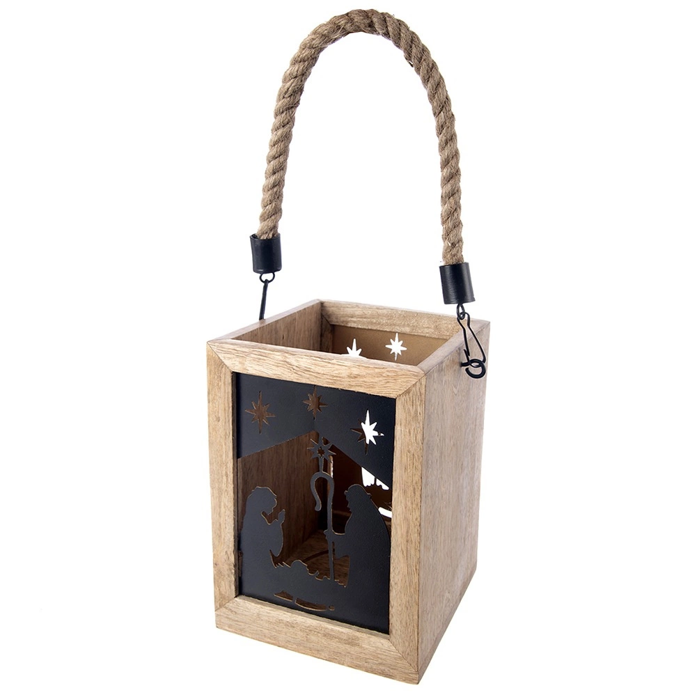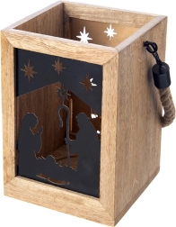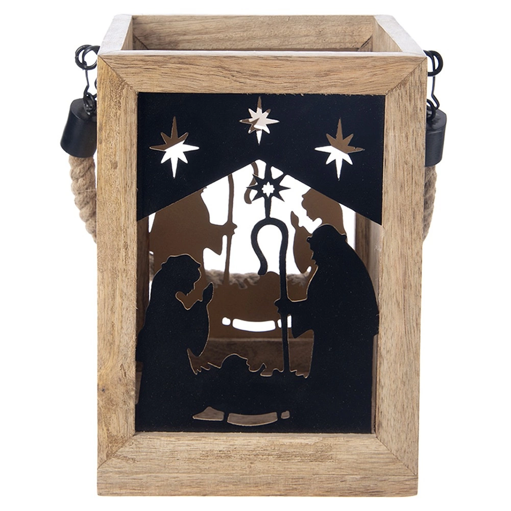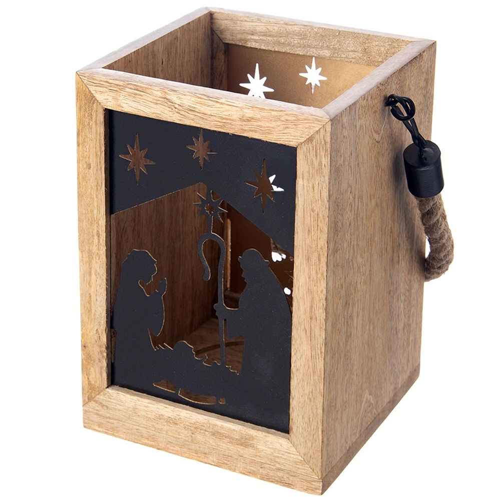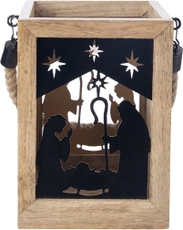 Varázsoljon karácsonyi hangulatot otthonába a 14 × 14 × 20 cm-es mangófából készült lámpással. A fekete fém panelek a Szent család és csillagok motívumával meleg fényt engednek át, és elbűvölő fényvetítéseket hoznak létre. A lámpás komódra, asztalra vagy padlóra helyezhető, de a masszív, fonott zsinórnak köszönhetően fel is akasztható.