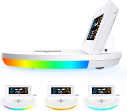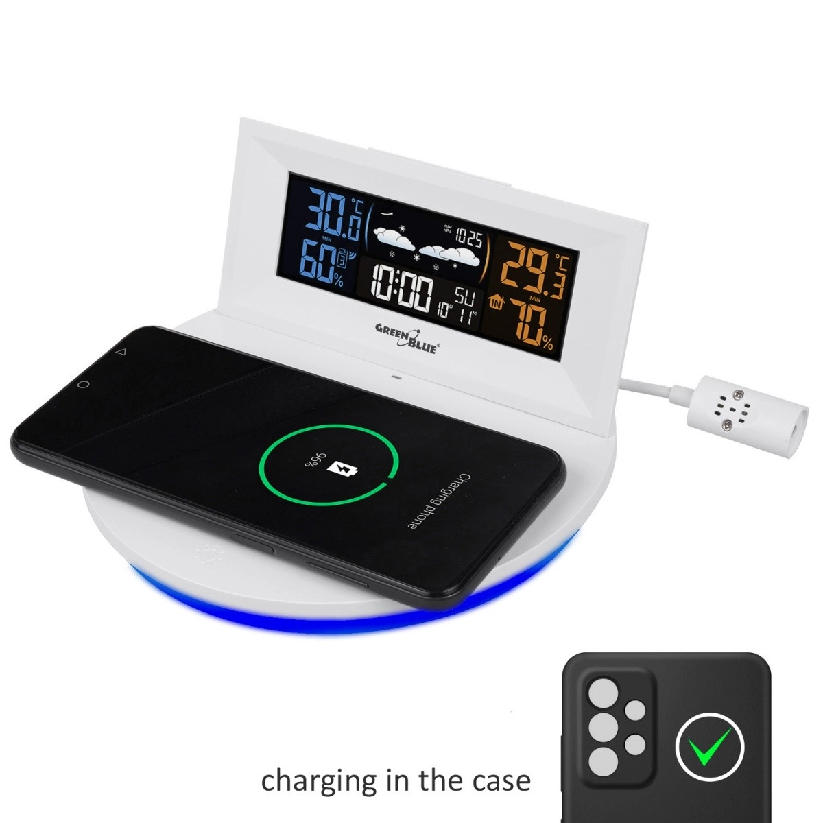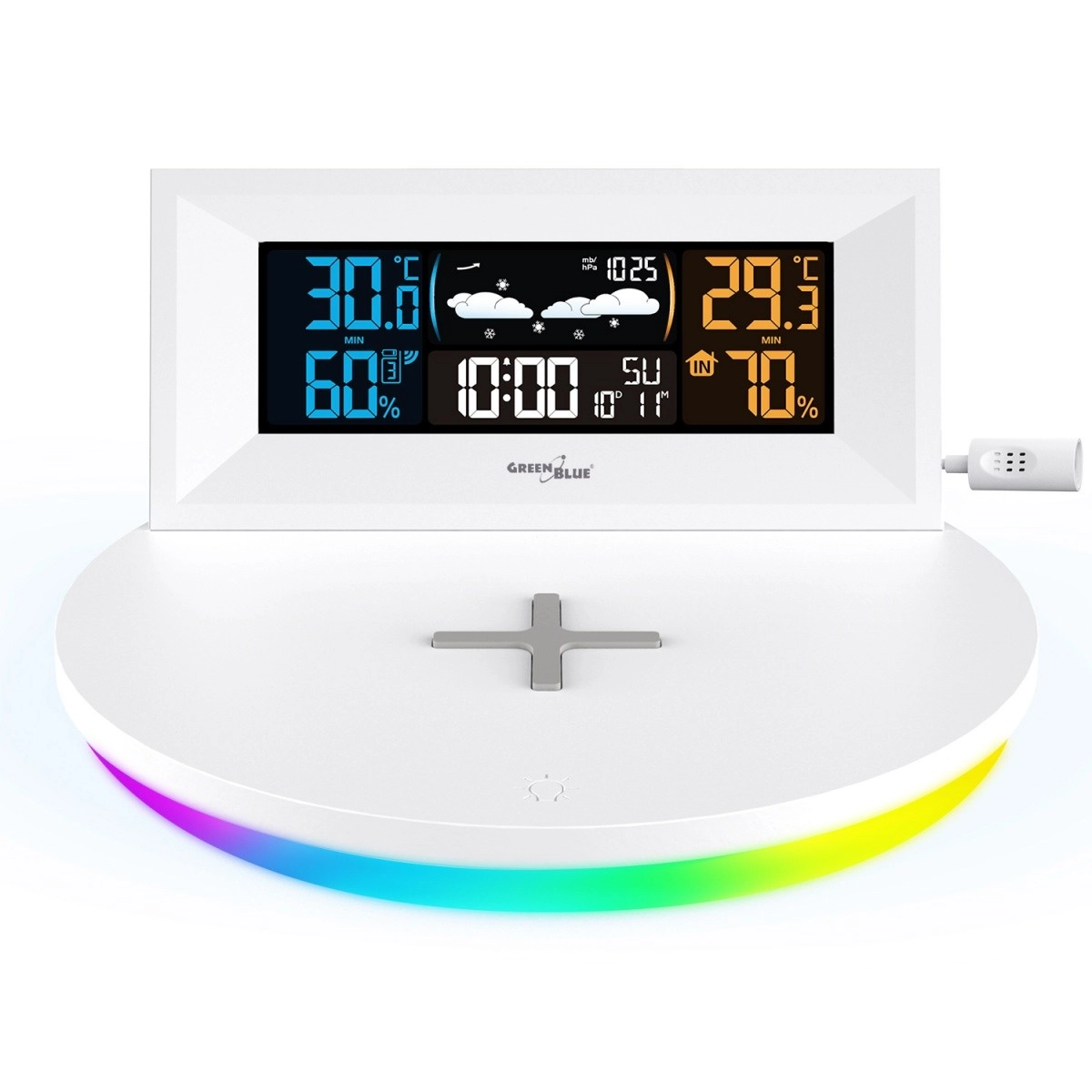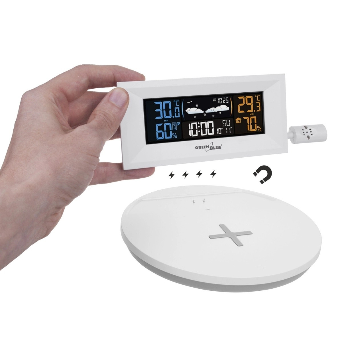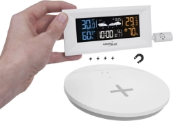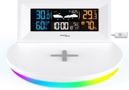 A modern GREENBLUE GB213 otthoni időjárás-állomás pontos időjárásmérést kombinál a praktikus telefontöltéssel. Kínál Qi vezeték nélküli töltést, színes LCD kijelzőt, külső vezeték nélküli érzékelőt, valamint órát ébresztővel és naptárral. Az áttekinthető kijelzésnek köszönhetően a hőmérsékletet, páratartalmat, légnyomást és a grafikus előrejelzést egyaránt láthatja, miközben a telefonját kényelmesen töltheti közvetlenül az alapegységről.