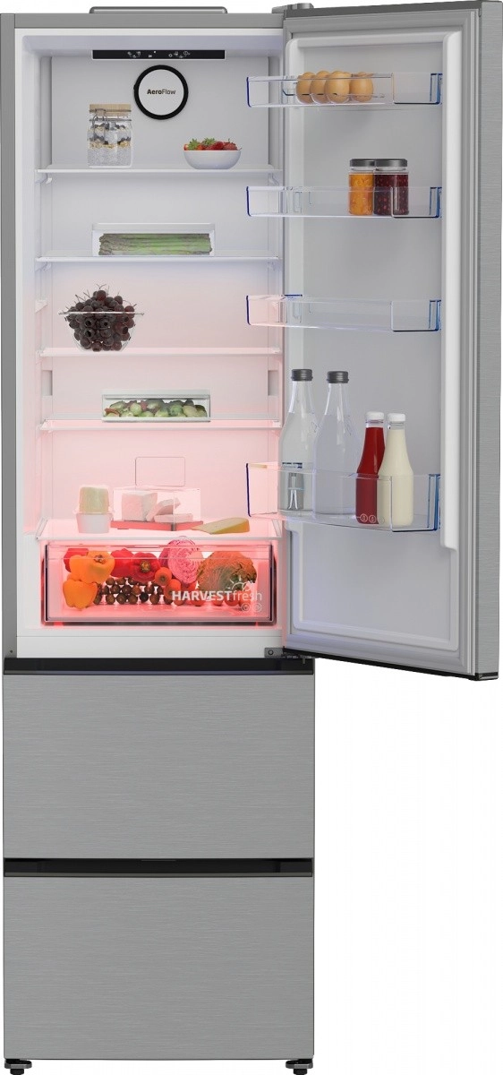 Ez a szabadon álló hűtő-fagyasztó alsó fagyasztóval ötvözi az elegáns dizájnt és az okos belső elrendezést. A széles hűtőrész állítható üvegpolcokkal, tágas ajtórekeszekkel és nagy gyümölcs- és zöldségtárolóval mindent áttekinthetően a helyén tart. A dupla fagyasztófiók kényelmes kezelést és jobb élelmiszer-szétválasztást kínál.
