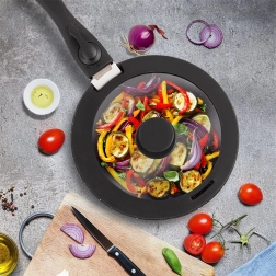 Praktikus boroszilikát üveg fedő rugalmas szilikon peremmel, amely szoros illeszkedést és biztonságos főzést biztosít felesleges hőveszteség nélkül. Az átlátszó üvegnek köszönhetően az étel folyamatosan szem előtt van, míg a hosszanti gőznyílás szabályozott gőzelvezetést tesz lehetővé és megkönnyíti a folyadék leöntését.
