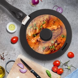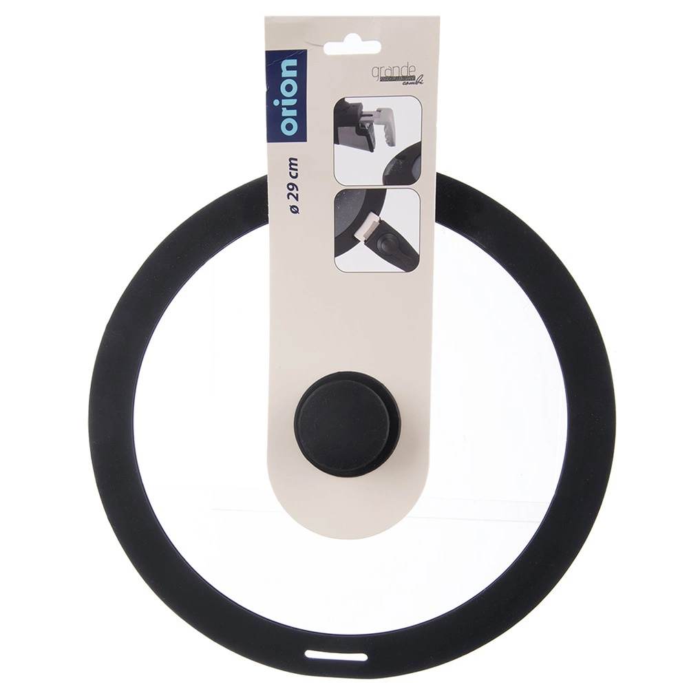 Univerzális, 29 cm átmérőjű üvegfedő széles szilikon peremmel 28 cm-es edényekhez. Kínál biztonságos, szoros illeszkedést, tartós boroszilikát üveget, hosszanti gőzkieresztő nyílást és praktikus kivágást a levehető nyélnek. Főzéshez, pároláshoz és sütéshez 220 °C-ig, mosogatógépben mosható.