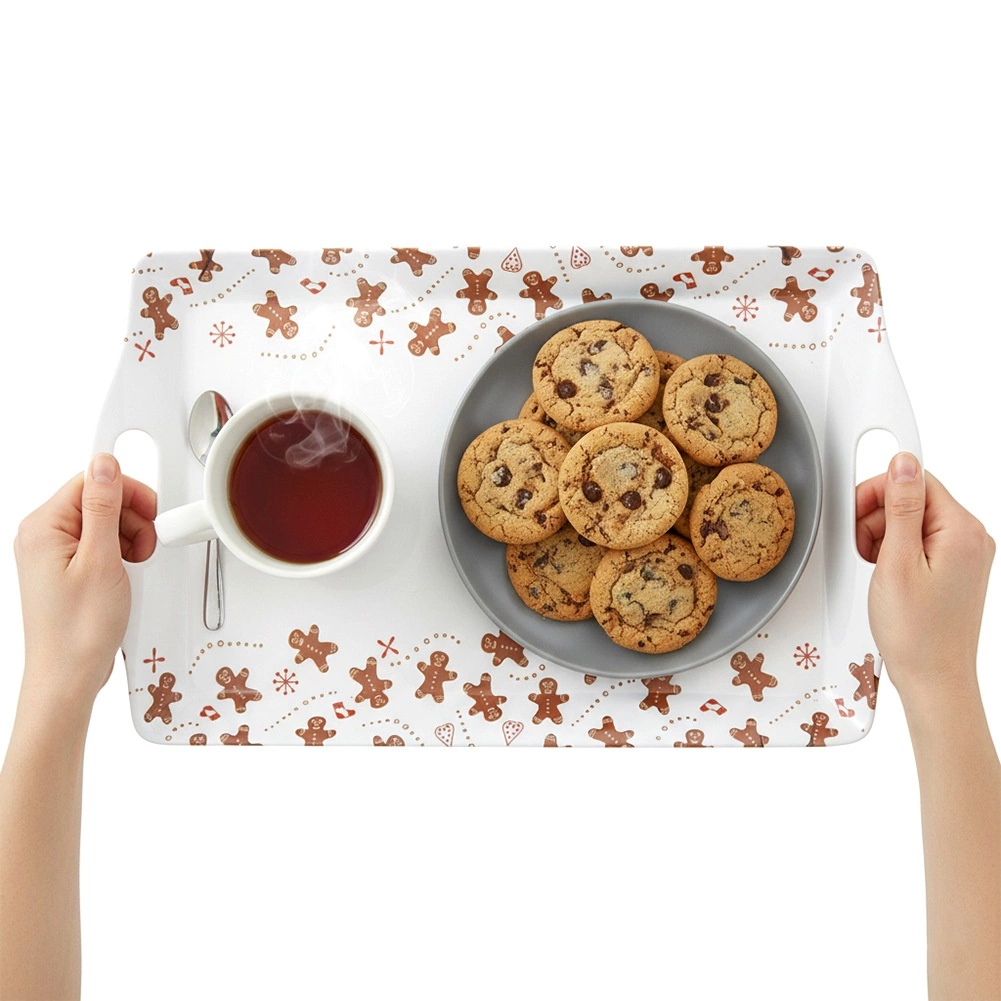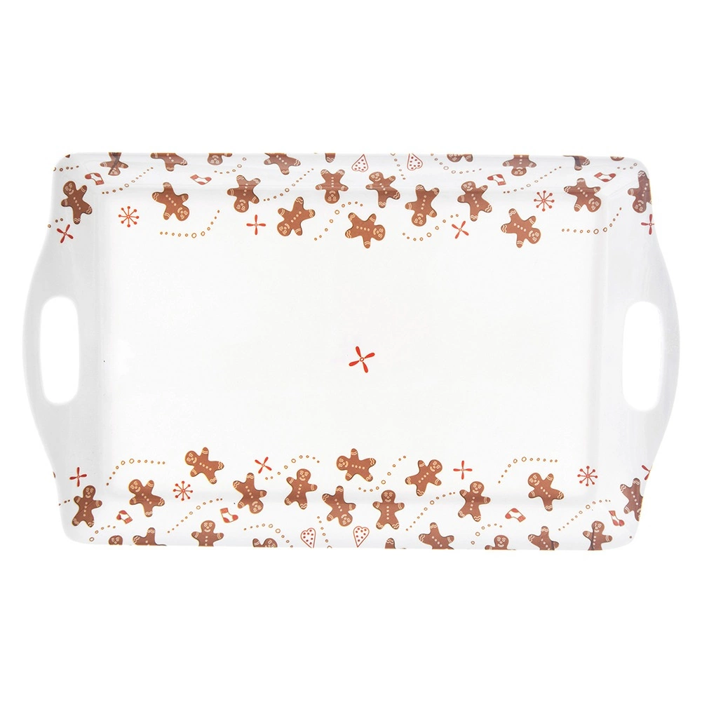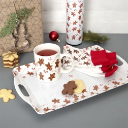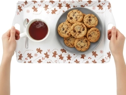 Praktikus és könnyű tálca 37,5 × 23 × 2,5 cm-es méretben, amely megkönnyíti a kávé, tea, desszertek és kisebb frissítők biztonságos hordozását. A fehér felületet mézeskalács figurák díszítik, amelyek ünnepi és játékos hangulatot adnak a szervírozásnak egész évben.