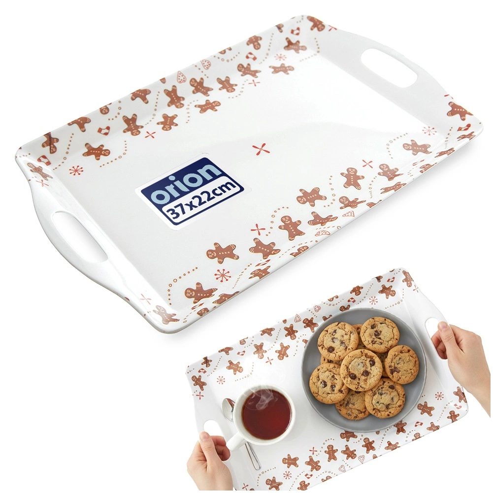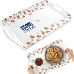 Stílusos, téglalap alakú tálalótálca mézeskalács motívummal, ideális italok, desszertek és reggelik felszolgálásához. A beépített fogantyúk, a megemelt perem és a strapabíró műanyag kényelmes hordozást és egyszerű tisztítást biztosít. Remek választás ünnepi asztalra és mindennapi használatra otthon vagy vendéglátásban is.