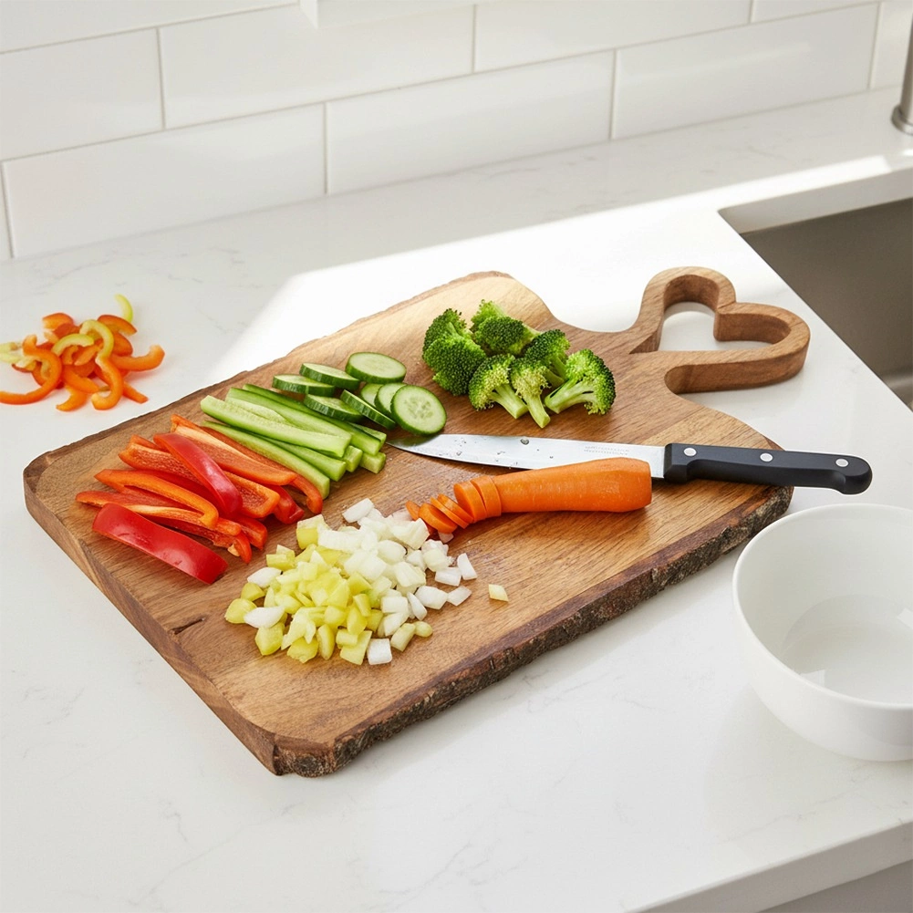 Ez a minőségi mangófa deszka a funkcionalitást és a természetes dizájnt ötvözi konyhádban. A 2 cm-es robusztus vastagság stabil vágást biztosít hús, zöldség és gyümölcs esetén, emellett remek tálalótálcaként is szolgál sajtokhoz és előételekhez. A praktikus szív alakú nyílás megkönnyíti a hordozást és a felakasztást.