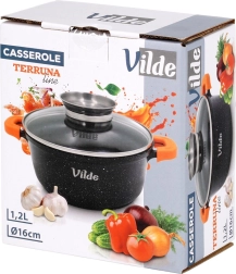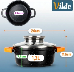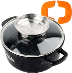 Kompakt, 1,2 l űrtartalmú, 16 cm átmérőjű gránit fazék üvegfedővel és szilikon fogantyúvédőkkel a biztonságos fogásért. Tartós, tapadásmentes gránit bevonat a zsírszegény főzéshez, a fedő integrált adagolója megkönnyíti a bor vagy víz hozzáadását a fedél felemelése nélkül. Alkalmas gáz-, elektromos-, kerámia- és indukciós főzőlapra, valamint sütőbe 200 °C-ig (fedő nélkül).