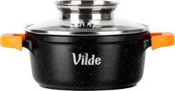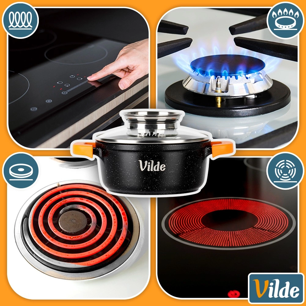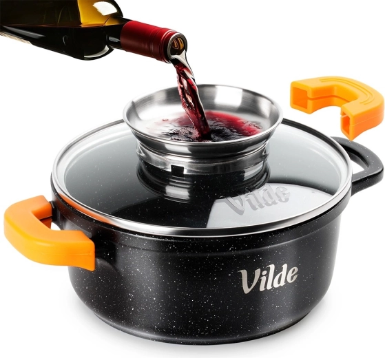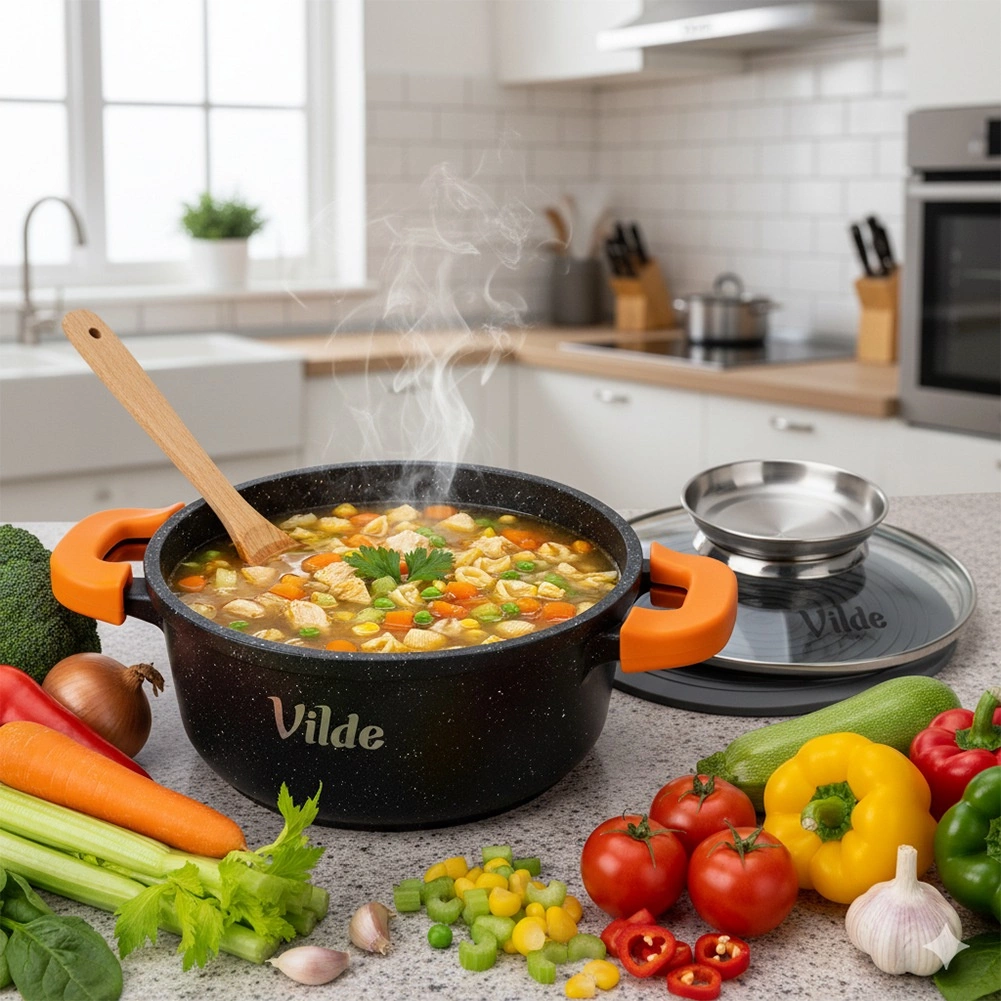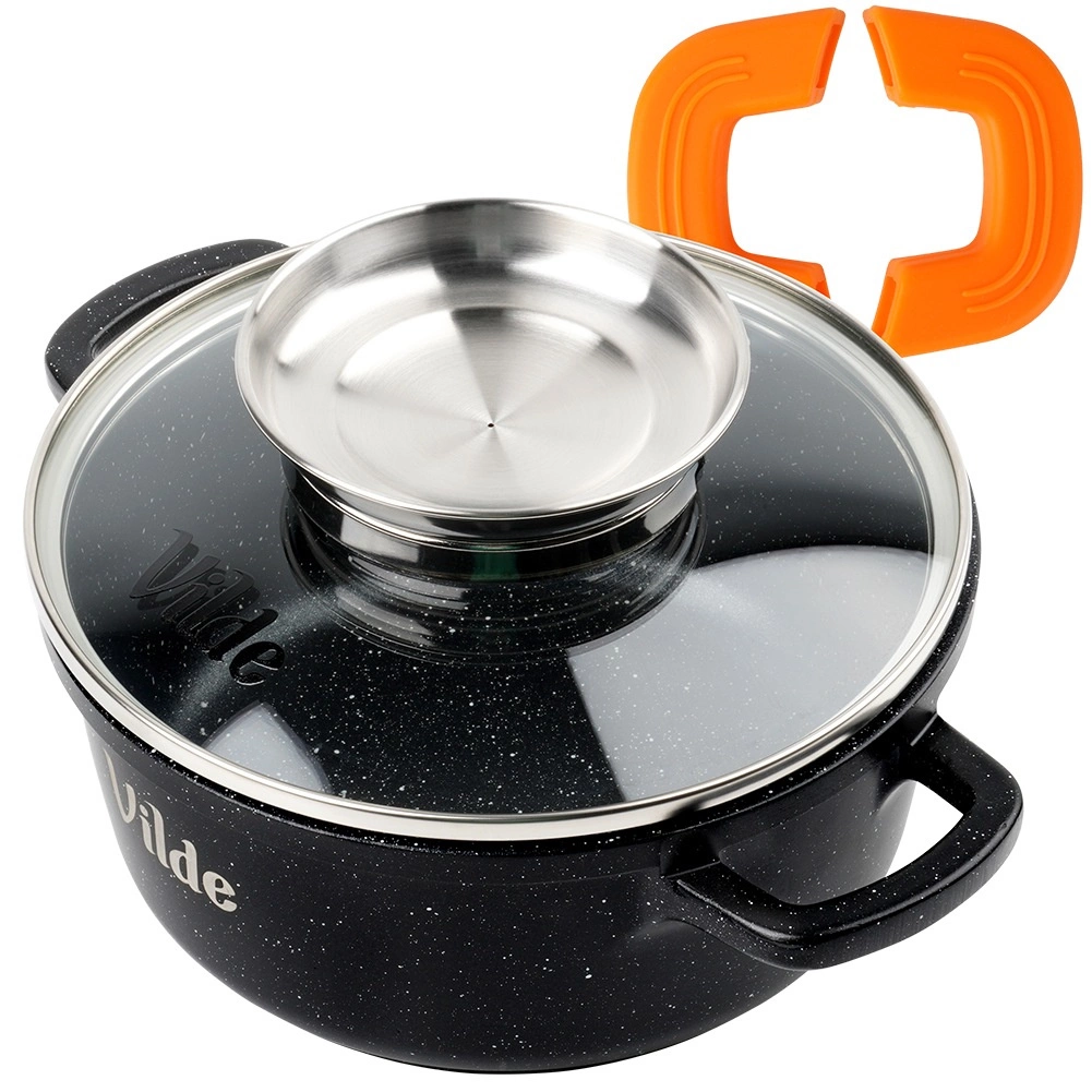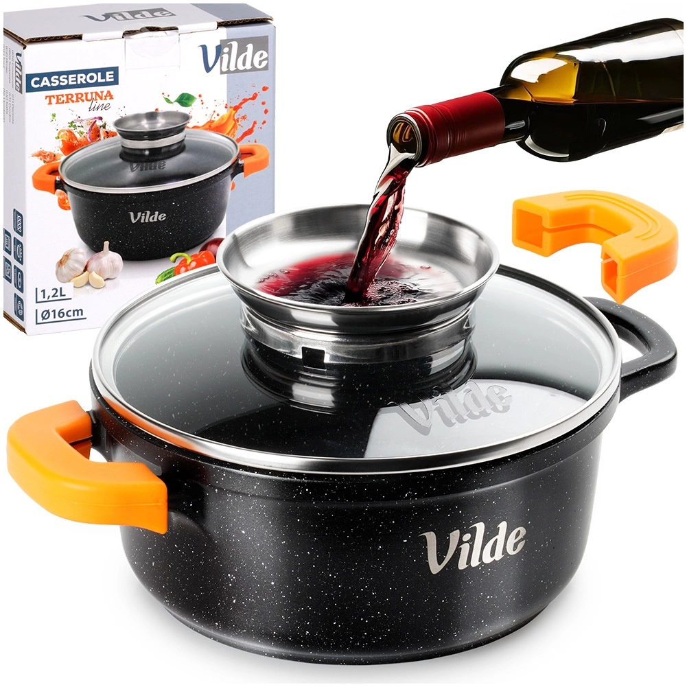 Sokoldalú öntött alumínium fazék gránit tapadásmentes bevonattal, ideális a mindennapi főzéshez – levesekhez, szószokhoz, párolt húsokhoz és rakott ételekhez. A rozsdamentes fogantyúval ellátott üvegfedő egyben folyékony ízesítők adagolójaként is szolgál, így a fedél felnyitása nélkül tölthet, megőrizve az állandó hőmérsékletet és az aroma zártságát.
