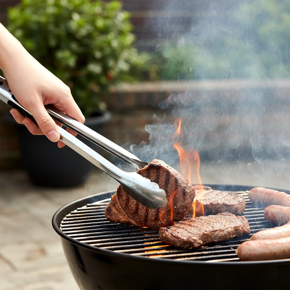 A recézett rozsdamentes acél végek biztonságosan megfogják a steakeket, zöldségeket és pékárut csúszás nélkül – ideális serpenyőhöz, tepsihez és grillhez.