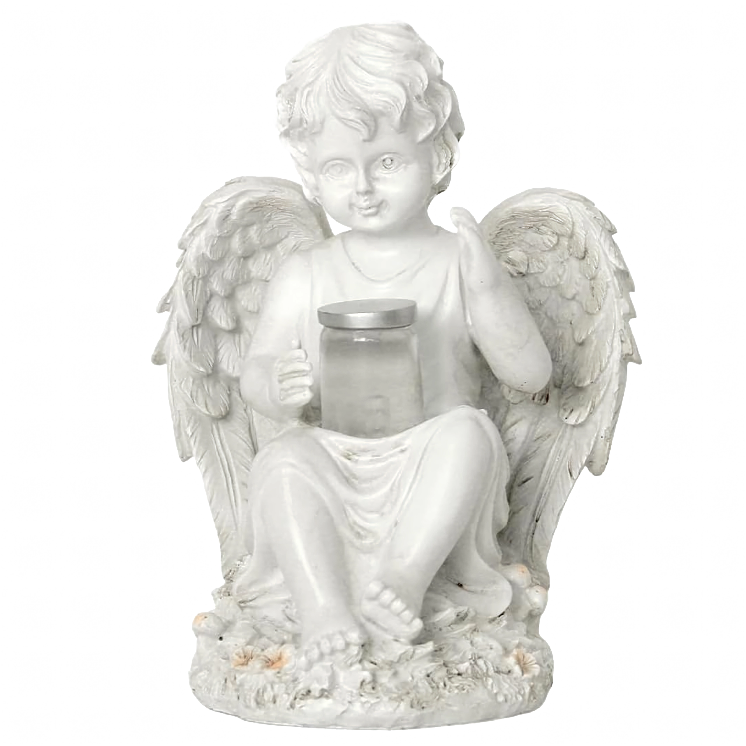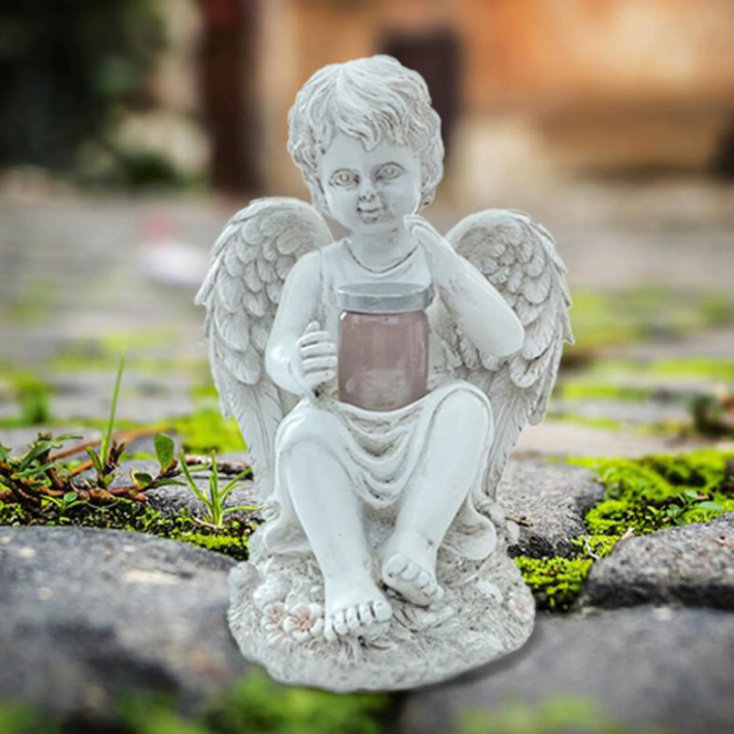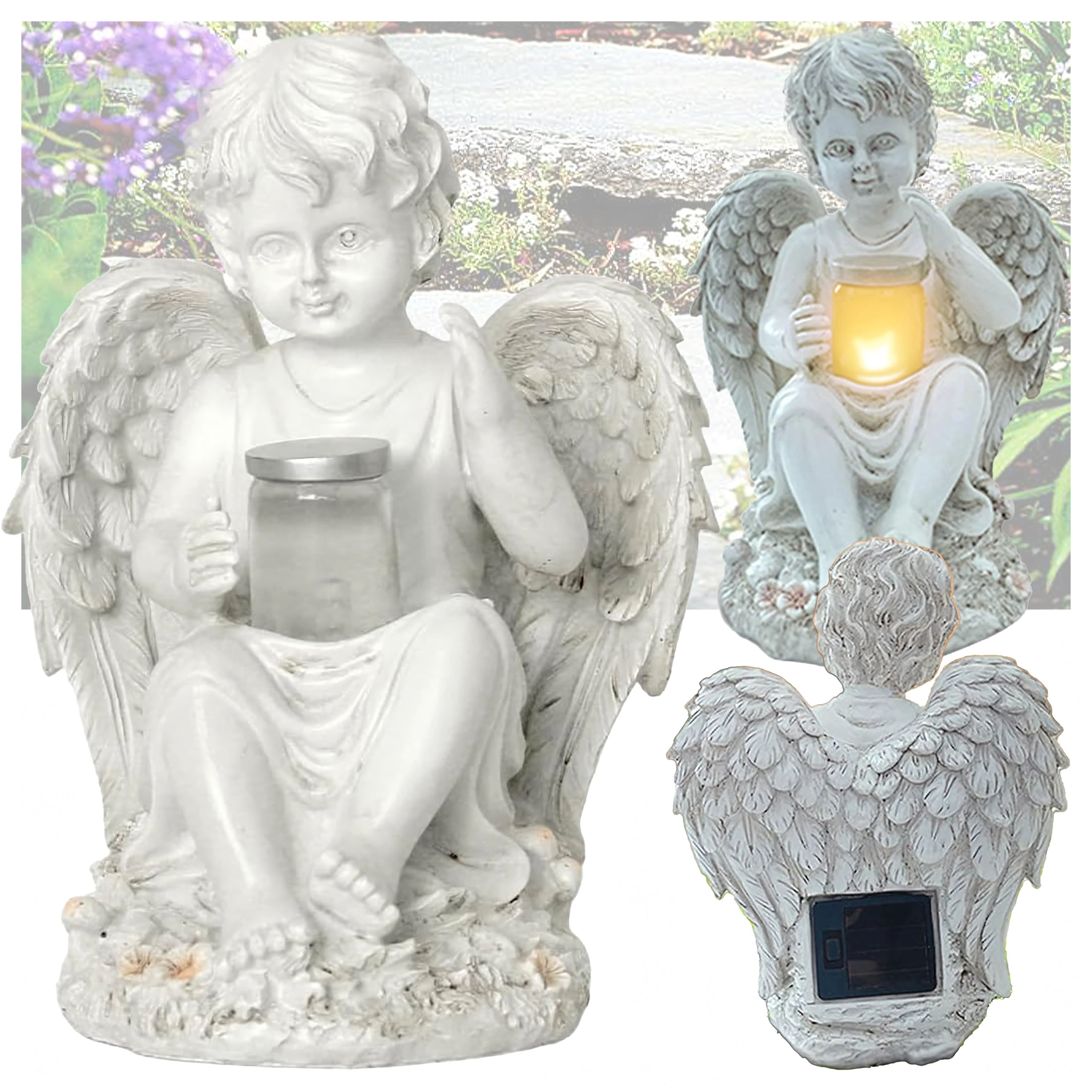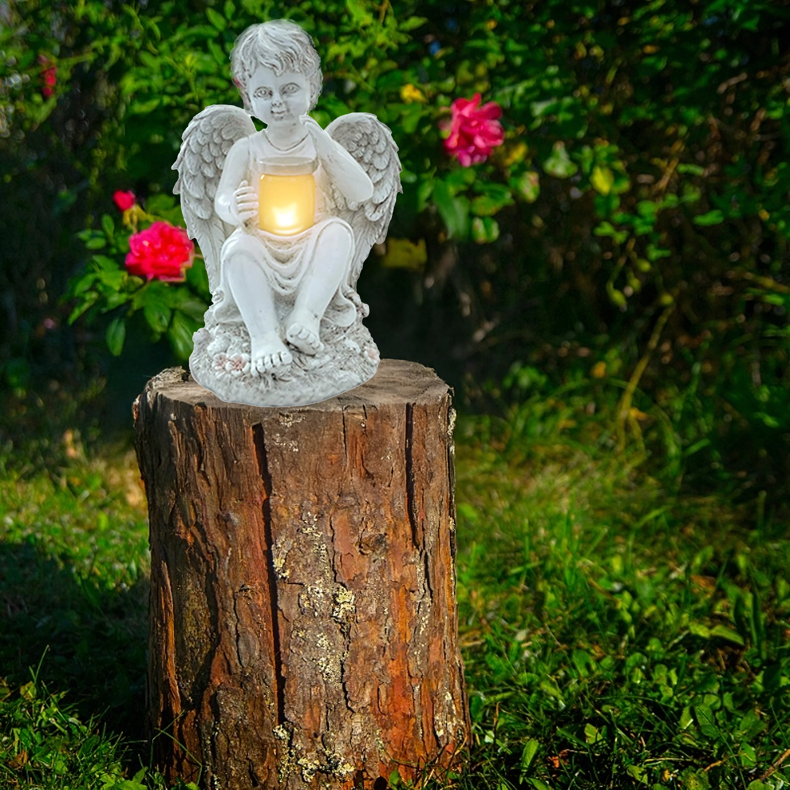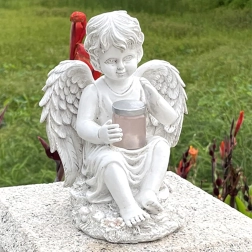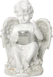 A tálkában, melyet az angyal tart, lágy, meleg fény teremt megnyugtató esti hangulatot a kertben vagy emlékhelynél.