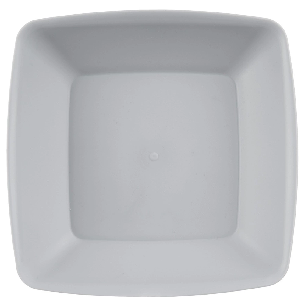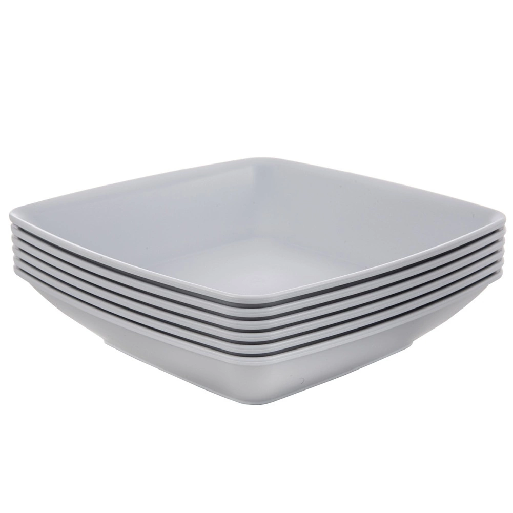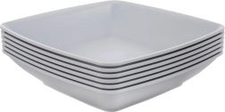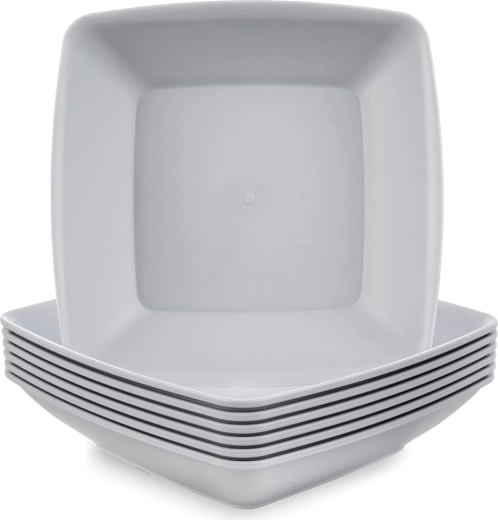 Könnyű és tartós, modern, négyzet alakú mélytányér-szett hat darabbal, ideális a mindennapi étkezéshez és kempingezéshez. Űrtartalma 500 ml, méretei 17,5 × 17,5 × 4,7 cm, és könnyen egymásra rakhatók. Használható mikrohullámú sütőben és mosogatógépben, erős műanyagból készült, elegáns szürke színben.