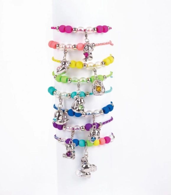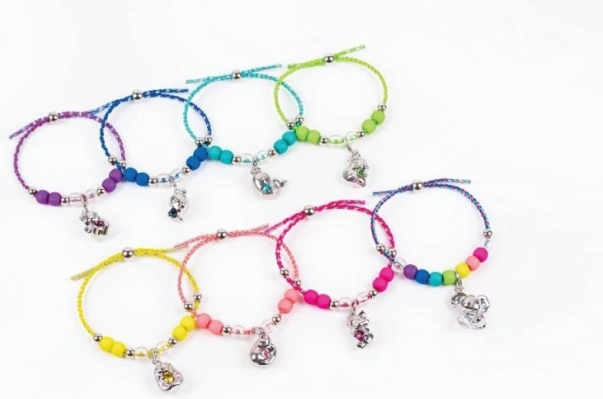 Tartalmaz egy, a figurához illő színű fonott zsinórt és 11 színes gyöngyöt. Könnyű felfűzés, kényelmes viselet és állítható méret gyerekcsuklóra.