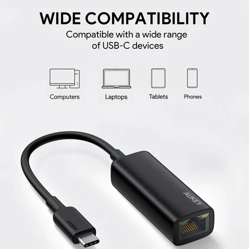 Az AUKEY USB‑C–RJ45 adapter megbízható gigabites ethernetet ad a laptophoz, ultrabookhoz vagy tablethez, gyors és stabil kapcsolathoz. A USB‑C csatlakozónak és az IEEE szabványoknak köszönhetően teljesen kompatibilis a modern eszközökkel és a régebbi hálózatokkal is.