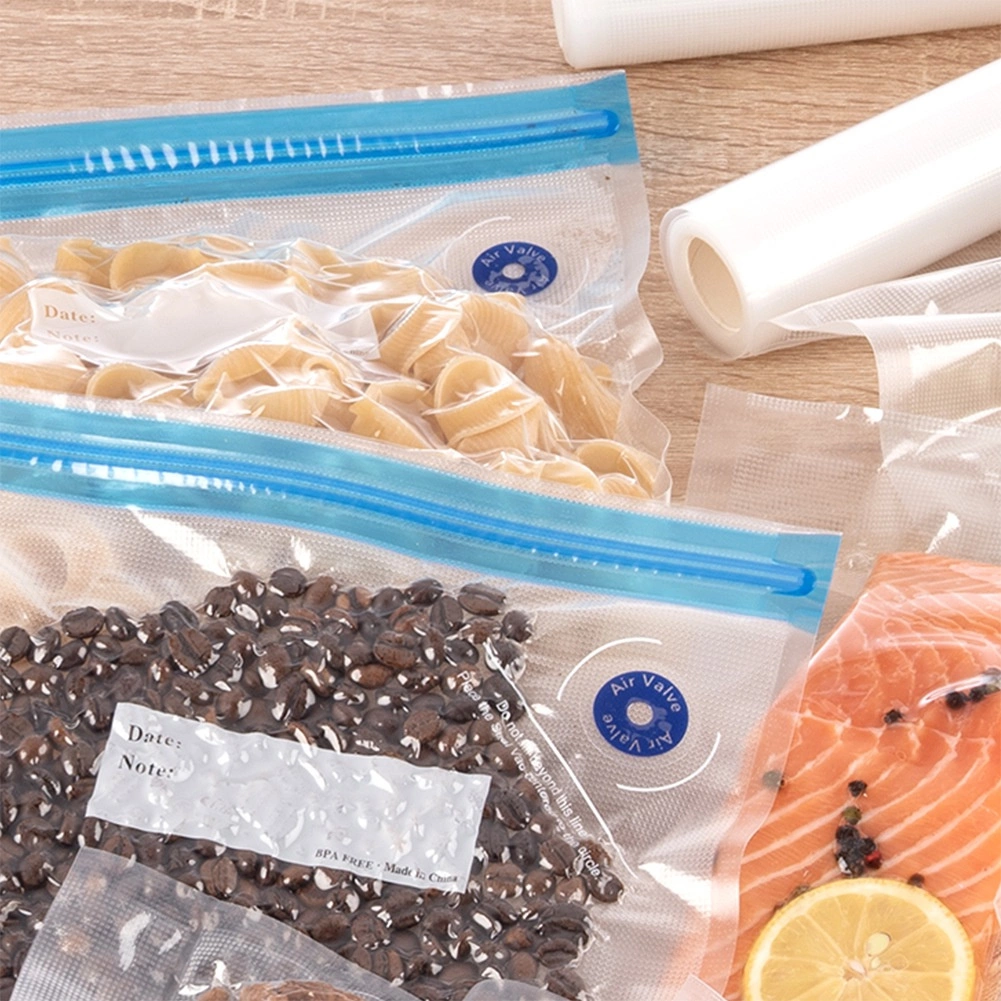 Erős, átlátszó fólia dupla cipzárral és szeleppel a gyors levegőkiszíváshoz, amely tovább frissen tartja az élelmiszereket, és megóvja őket a nedvességtől, portól és szagoktól.