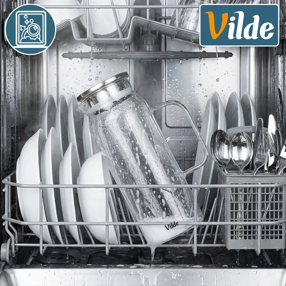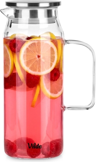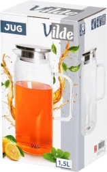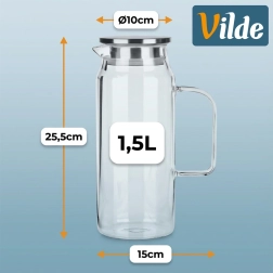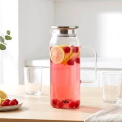 Elegáns üvegkancsó 1,5 l űrtartalommal, rozsdamentes acél fedéllel, szűrővel és tömítéssel. A tartós boroszilikát üveg -20 °C-tól 150 °C-ig bírja a hőmérsékletet, a fedél pedig 100 °C-ig. A praktikus kettős kiöntőrendszer a gyümölcsöt, jeget és fűszernövényeket a kancsóban tartja, és megkönnyíti a tiszta tálalást.