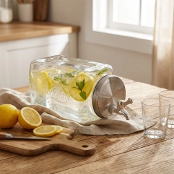 Stílusos, 3,3 l űrtartalmú üveg adagoló praktikus csappal, ideális házi limonádé, gyümölcsös víz vagy jeges tea tálalásához. Lapos formájának köszönhetően könnyen elhelyezhető a hűtő polcán, a széles nyíláson át pedig kényelmesen tölthető és tisztítható. Masszív, erős üveg, rozsdamentes acél tető és szorosan záródó csavaros fedél óvja az italt a szennyeződésektől és a rovaroktól, míg a kényelmes csap tiszta, csöpögésmentes öntést biztosít.