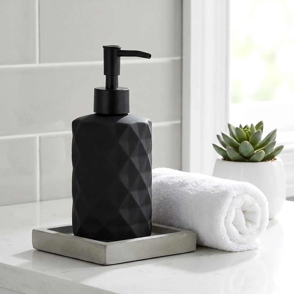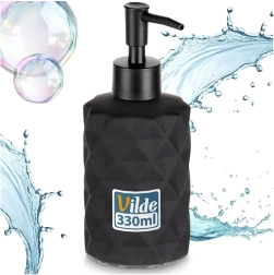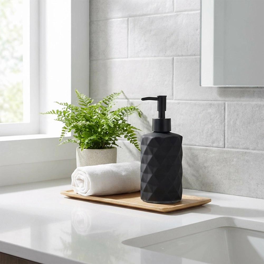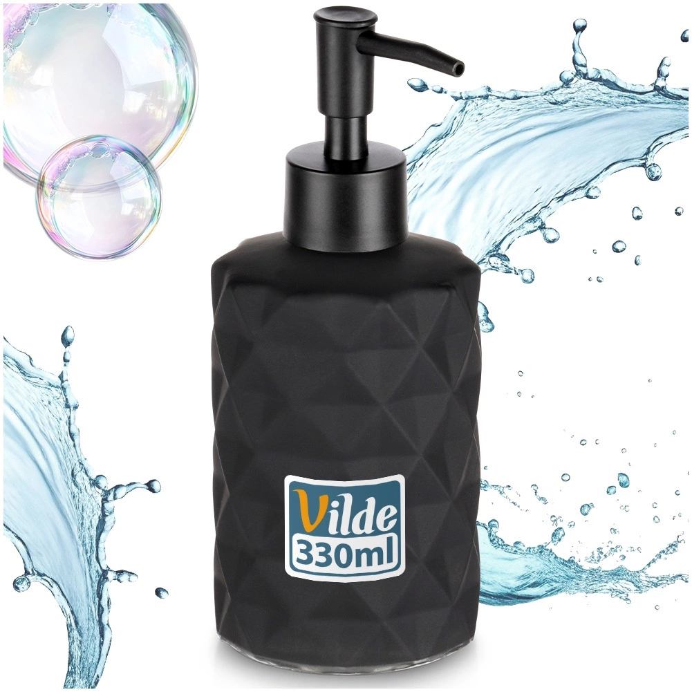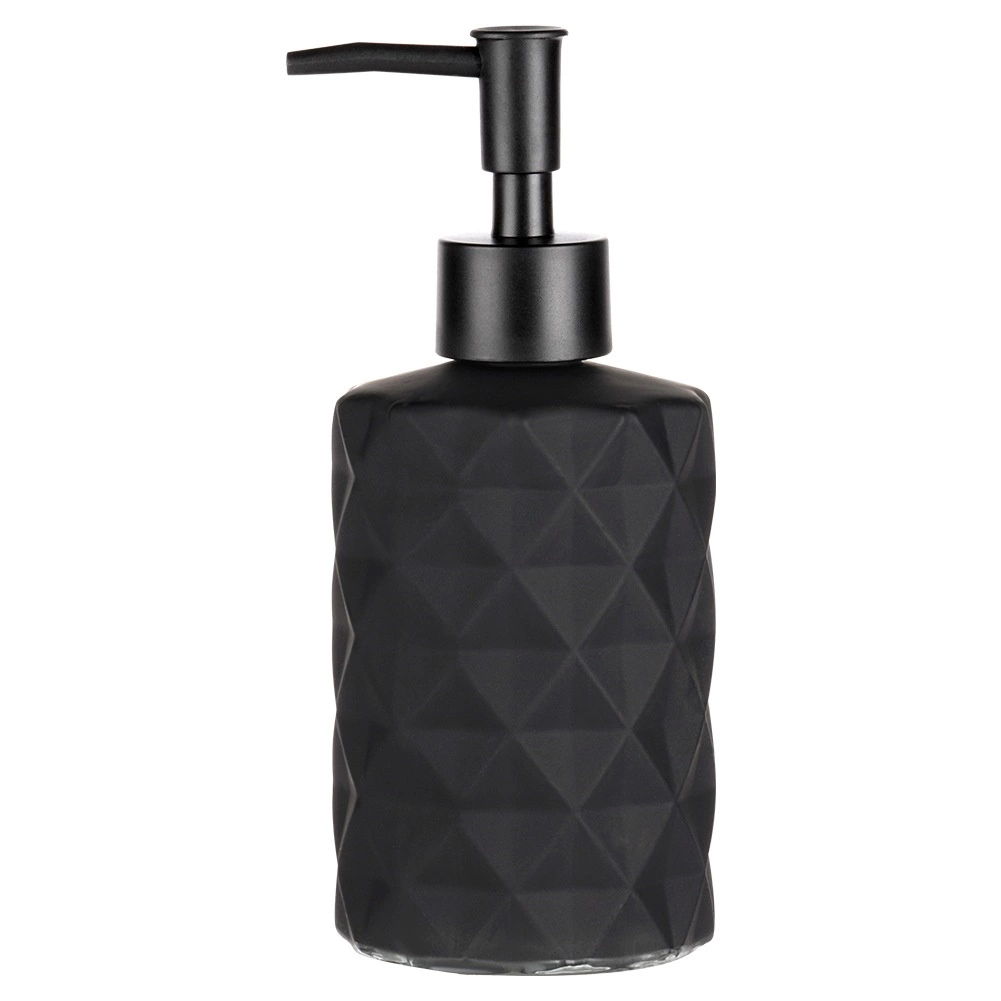A matt fekete színű üveg szappanadagoló a esztétikumot és a funkcionalitást ötvözi. A félig átlátszó, dekoratív üveg segít ellenőrizni a töltöttséget, míg a tartós pumpa egyenletes adagolást biztosít. Ideális folyékony szappanhoz, fertőtlenítőhöz vagy mosogatószerhez.