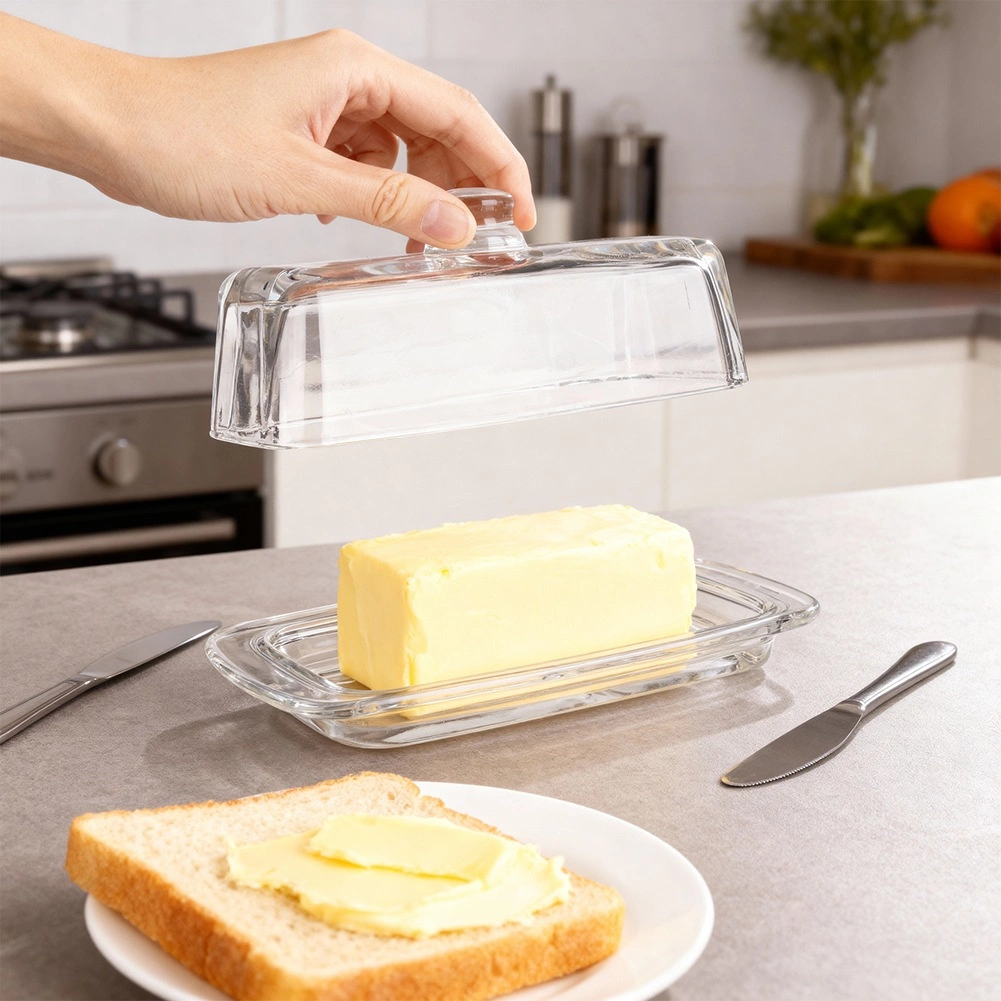 Az átlátszó üvegnek köszönhetően bármikor ellenőrizheti a megmaradt vaj mennyiségét anélkül, hogy fel kellene emelnie a fedelet.
