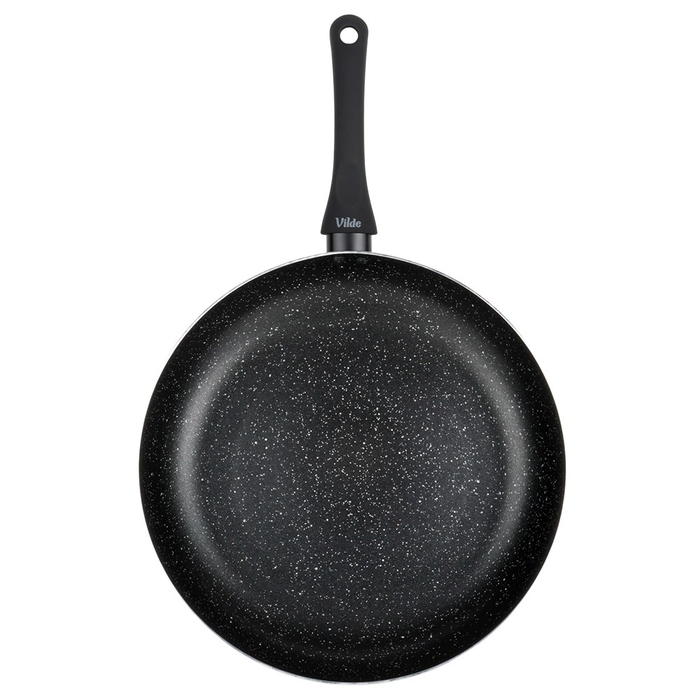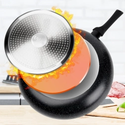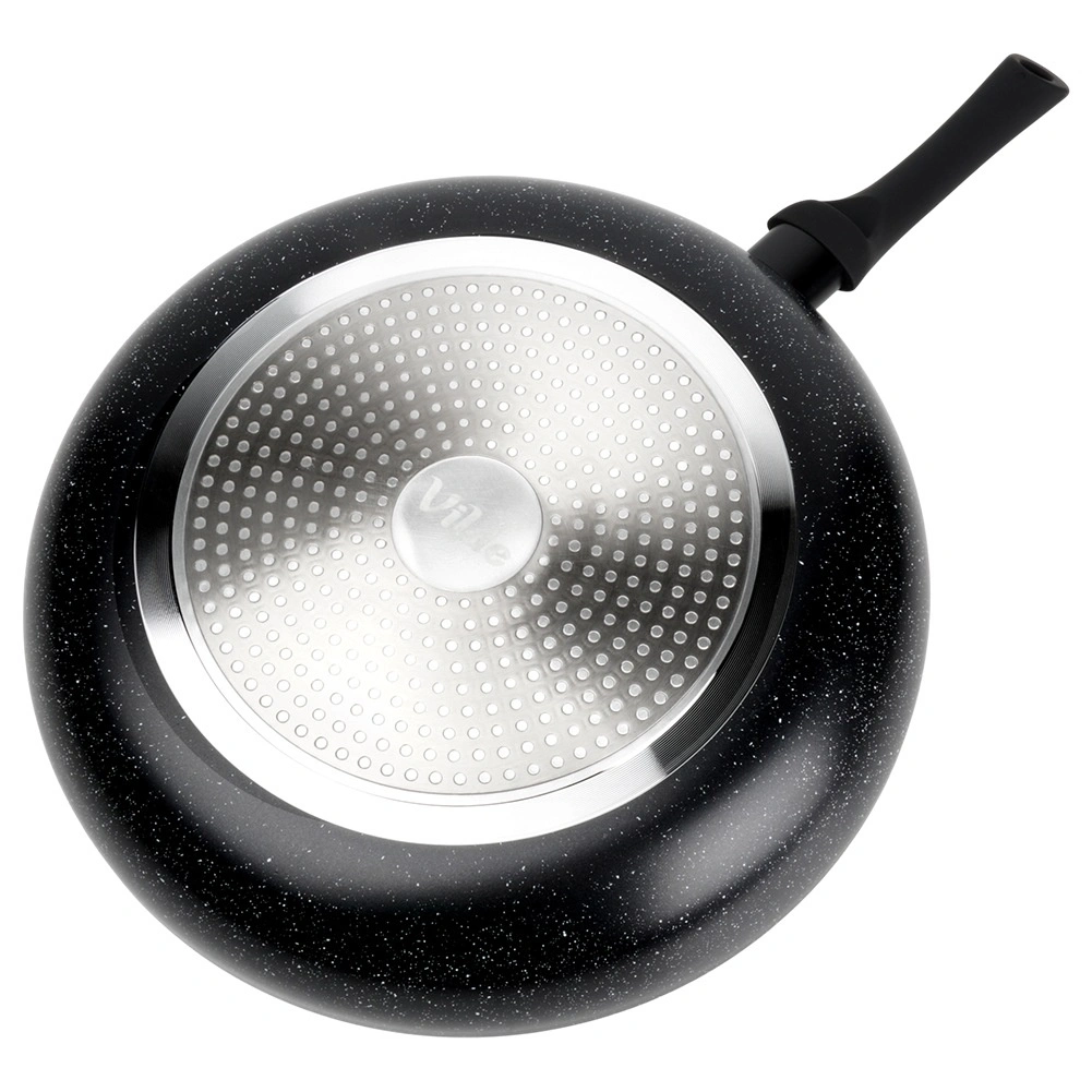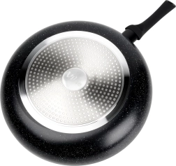 A masszív alumínium test és a többrétegű kialakítás a serpenyő teljes felületén elosztja a hőt, energiatakarékos és egyenletes sütést biztosítva forró pontok nélkül.