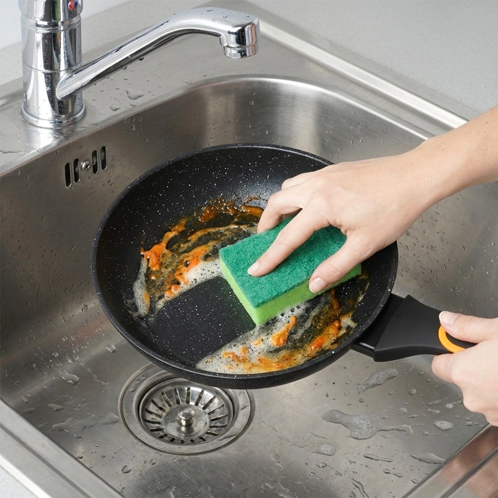 A tartós gránit felület megakadályozza az odatapadást, és lehetővé teszi a főzést minimális zsiradékkal. Az étel könnyen elválik, a serpenyő pedig gyorsan tisztítható.