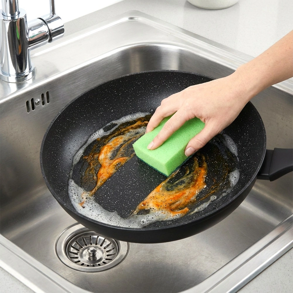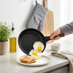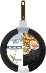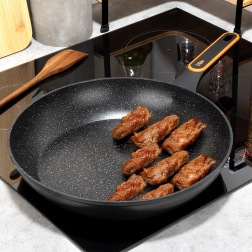A kőhatású felület minimalizálja az odatapadást, és lehetővé teszi a sütést minimális olajjal. Az étel könnyen forgatható, a serpenyő pedig gyorsan tisztítható.