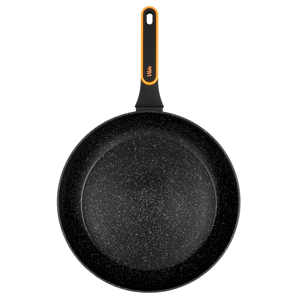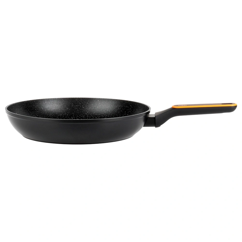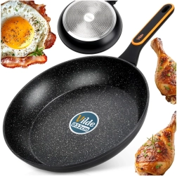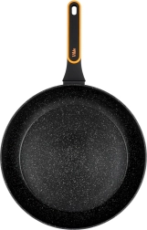 Masszív, öntött alumíniumból készült serpenyő modern, kőhatású megjelenéssel, ideális sütéshez és pároláshoz. A tartós, tapadásmentes gránit bevonat fekete színben könnyű ételkioldást és gyors tisztítást biztosít – akár mosogatógépben is. Az ergonomikus, csúszásmentes felületű nyél praktikus akasztónyílással főzés közben nem melegszik fel.